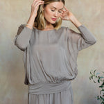 - Boat neck, three-quarter length sleeve with banded cuffs, banded hem, comfortable knit jersey lining, silk overlay.