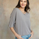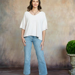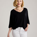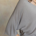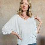 A versatile essential, the Esma Knit Top brings softness and sophistication to your spring wardrobe. Its drapey silhouette, dolman 3/4 sleeves, and soft v-neck create a relaxed yet polished look perfect for any occasion. Pair it with our Madelyn Silk Pants for refined elegance, the Lenore Linen Pants for breezy charm, or your favorite jeans for effortless comfort.