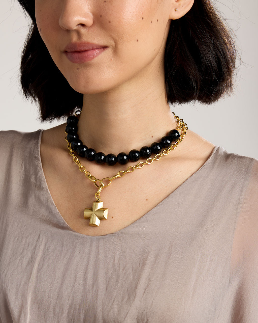 The Susanne necklace brings together two timeless elements—lustrous pearls or onyx and a polished chain—for a look that’s equal parts classic and contemporary. Designed to sit just at the collarbone, this striking half-and-half necklace makes a subtle statement whether worn alone or layered.