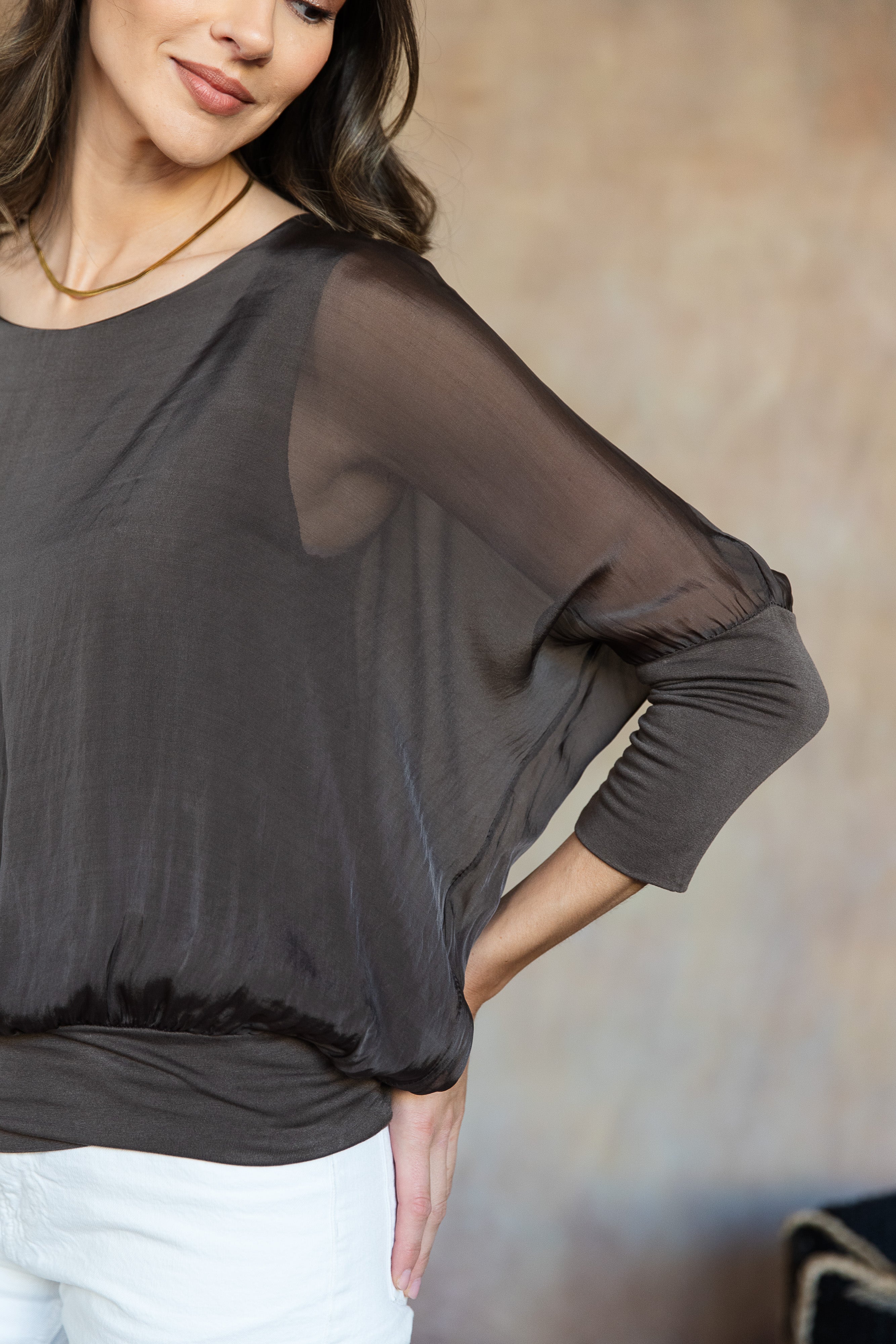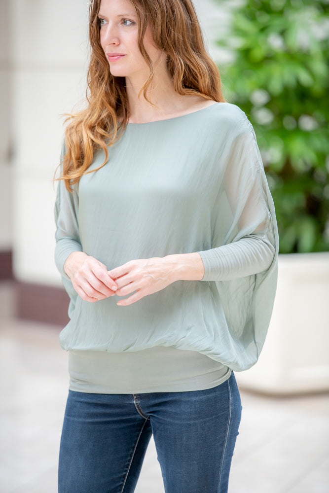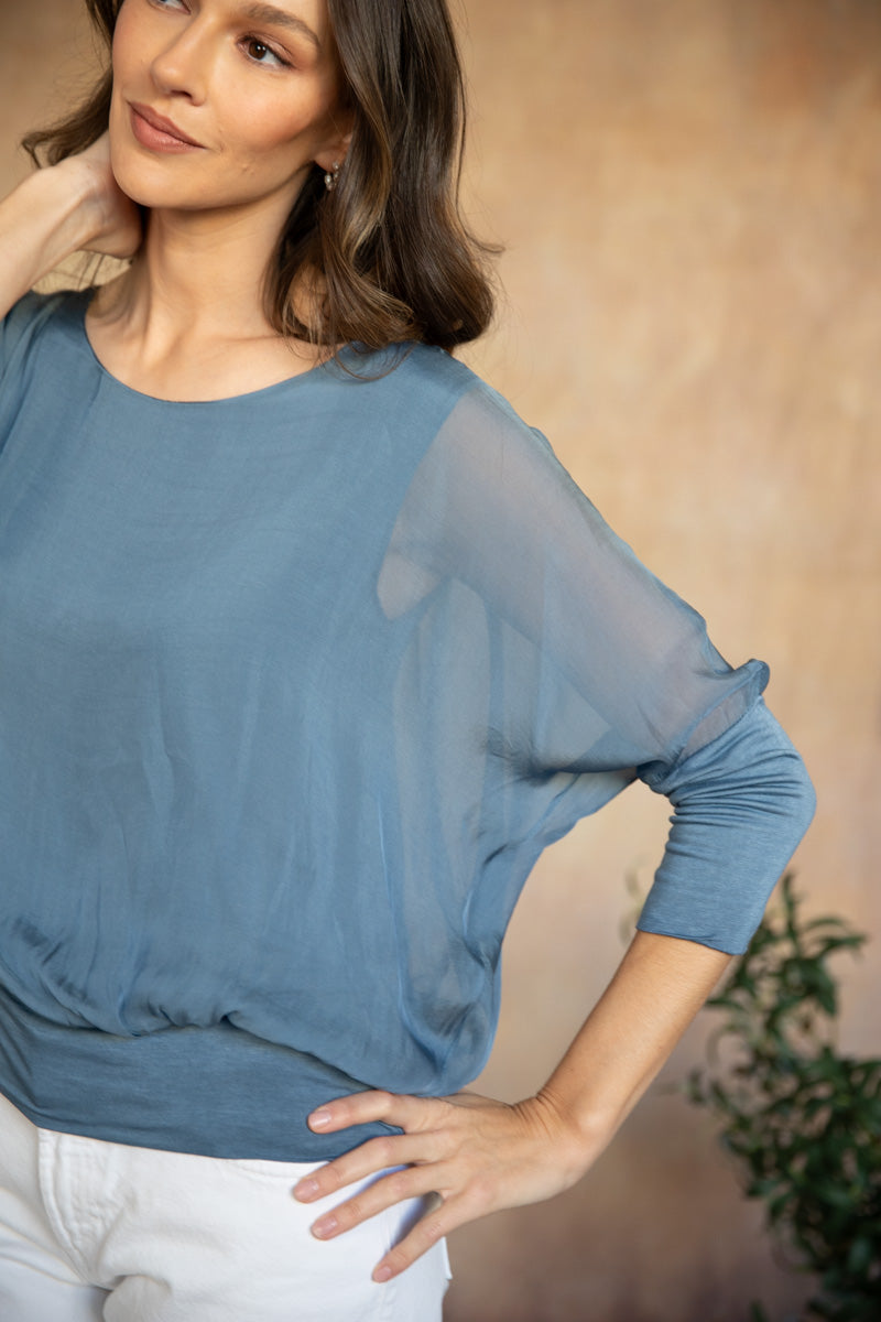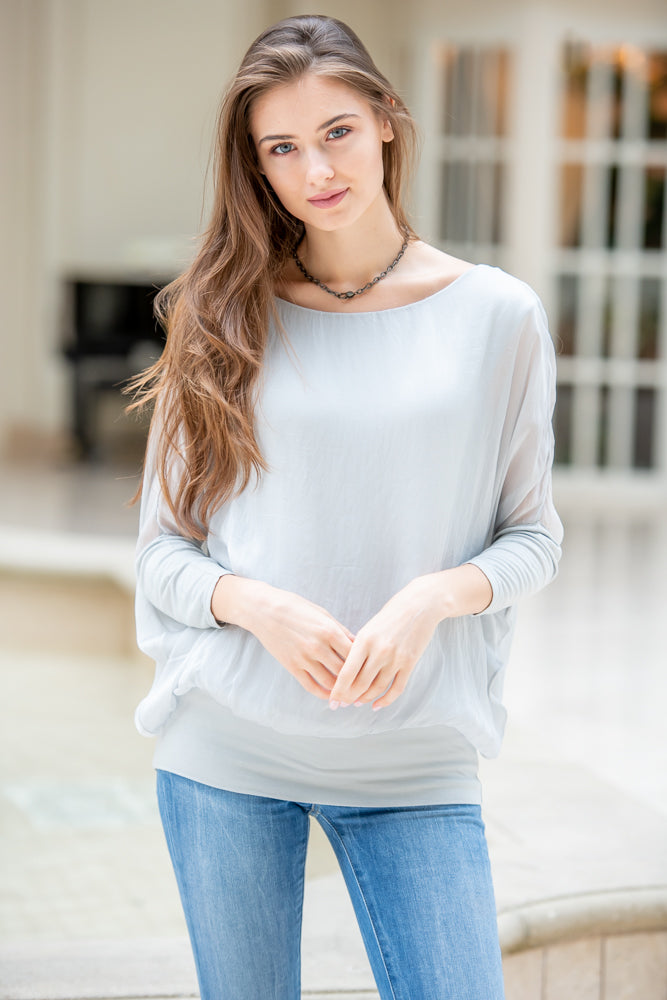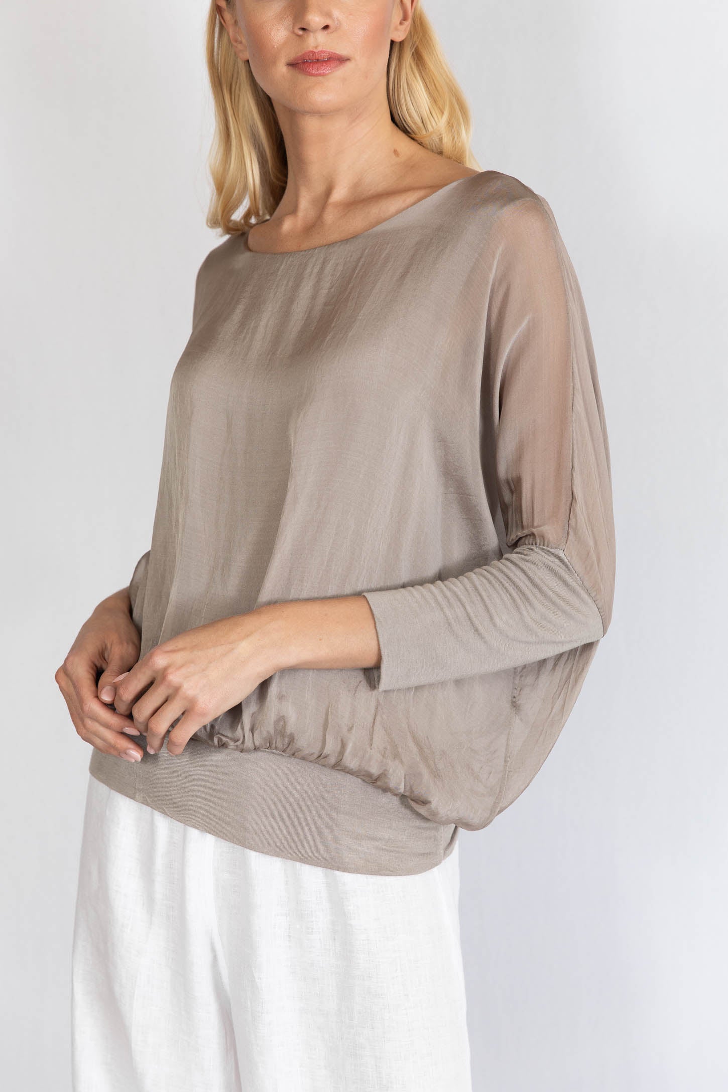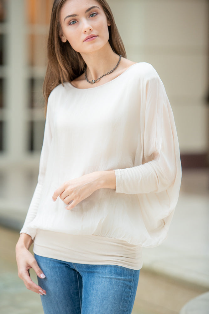 - Boat neck, three-quarter length sleeve with banded cuffs, banded hem, comfortable knit jersey lining, silk overlay.
