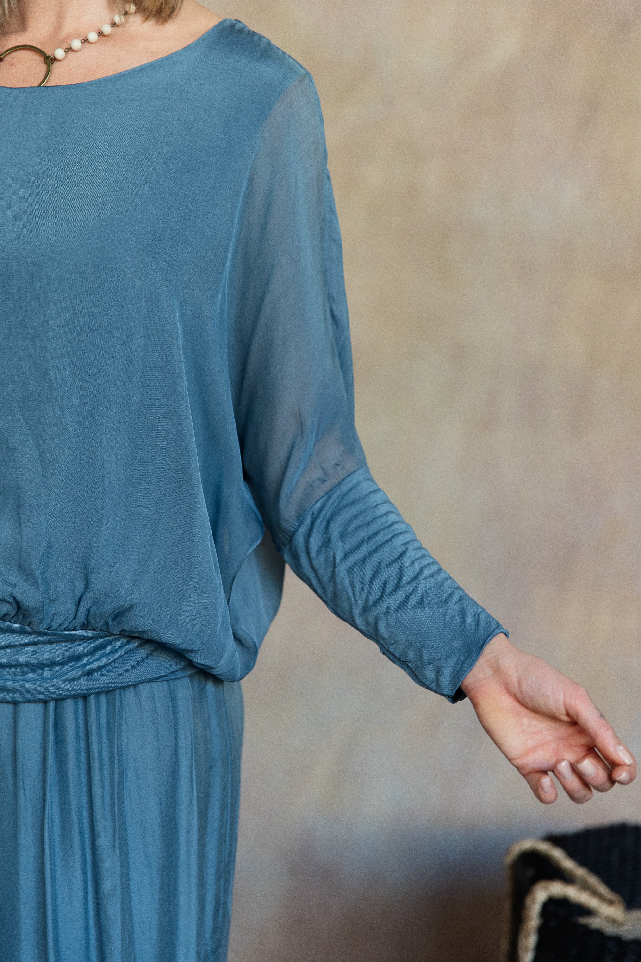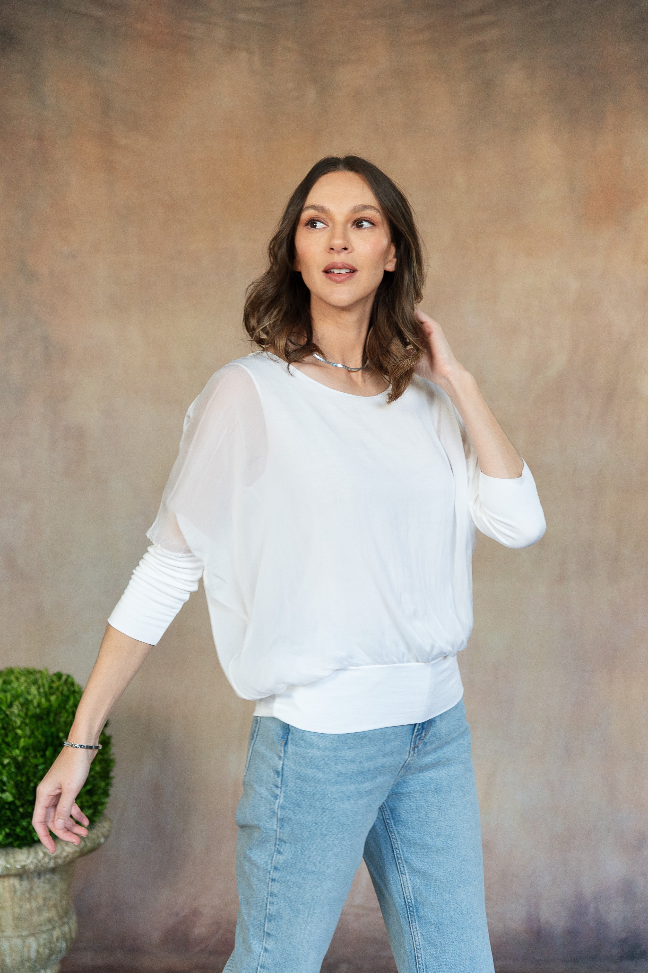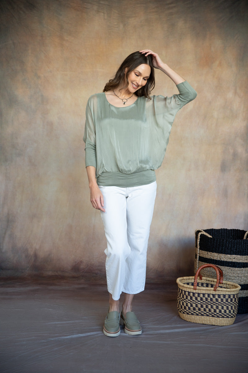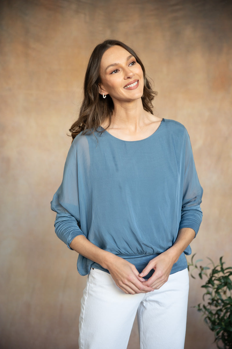 - Boat neck, three-quarter length sleeve with banded cuffs, banded hem, comfortable knit jersey lining, silk overlay.