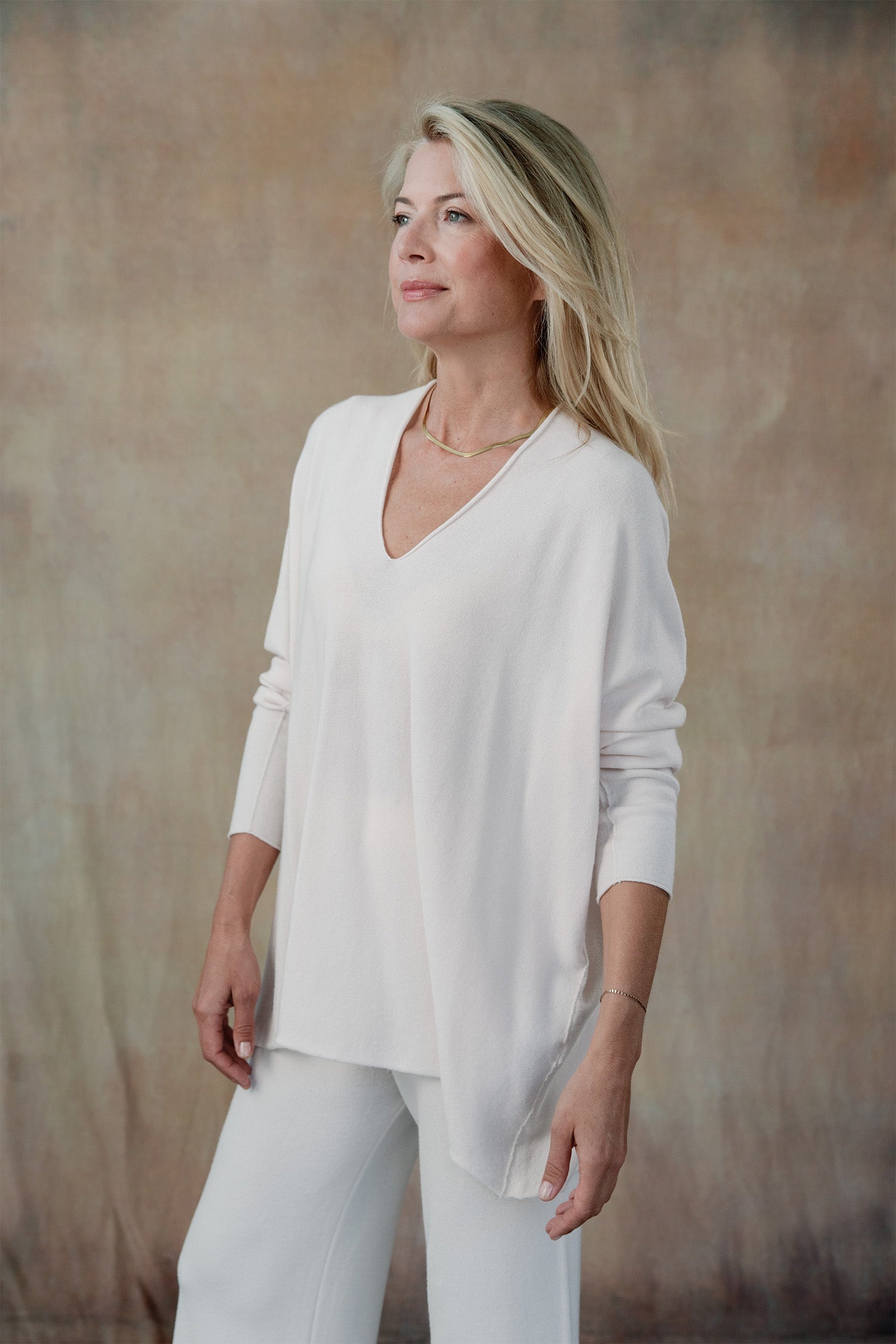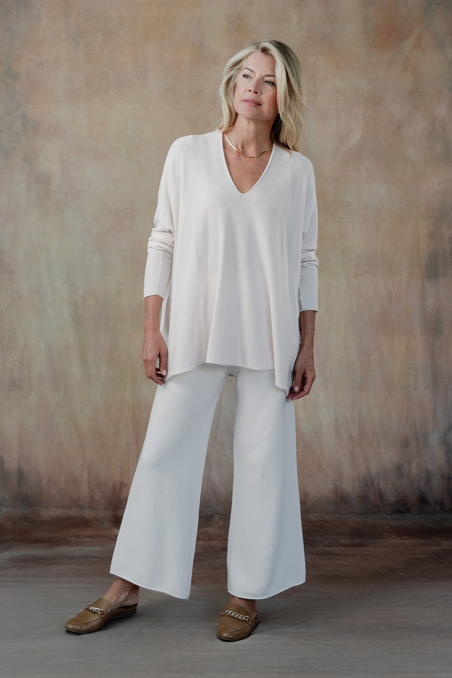 Indulge in cozy elegance with our Claudia V-Neck Sweater, crafted from irresistibly soft knit fabric that feels like a dream. This fan-favorite piece features a flattering neckline and high-low hem, creating a drapey silhouette that pairs beautifully with our Cleo Sweater Pants. Part of our Mix-and-Match Knitwear capsule.