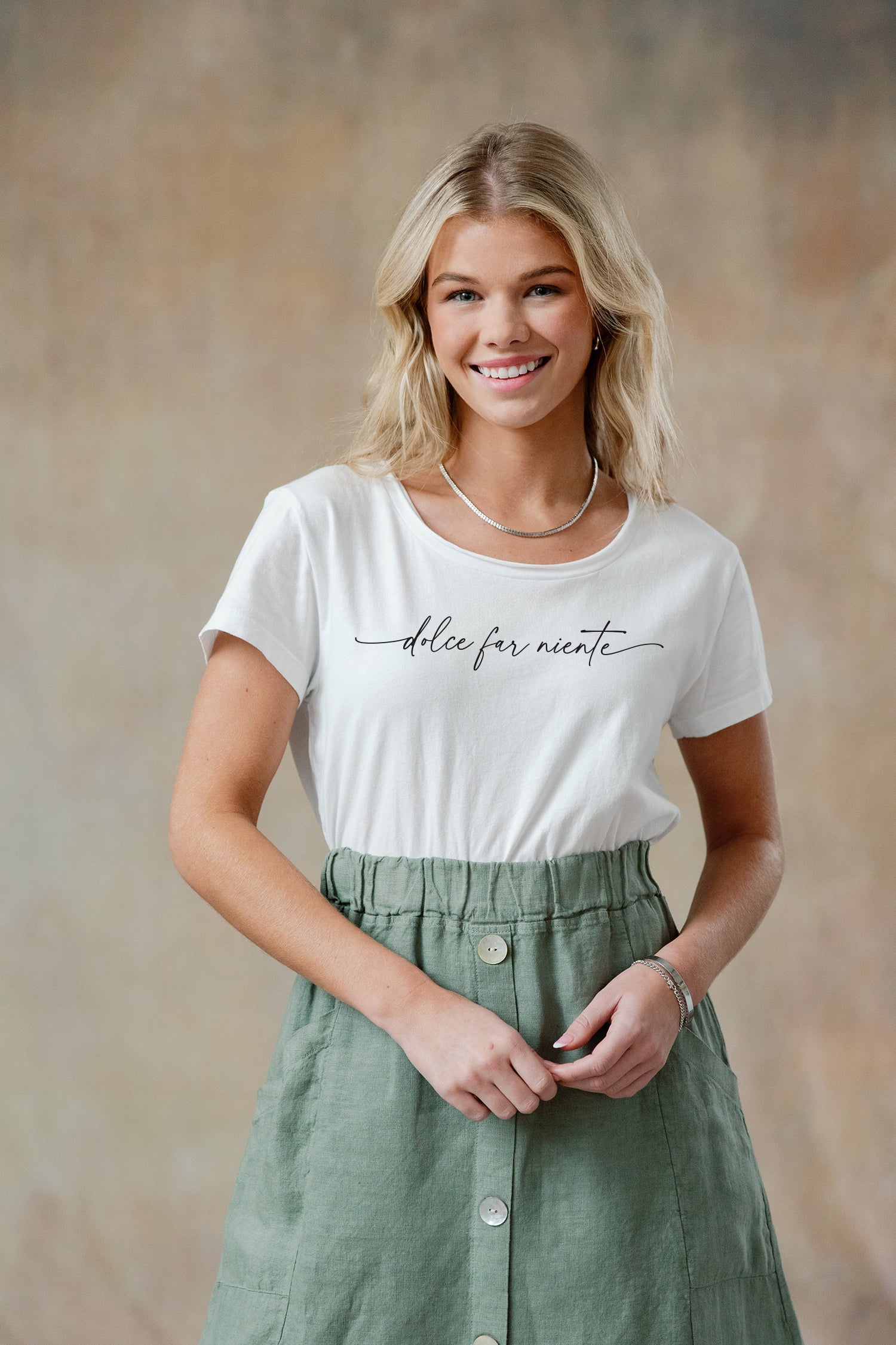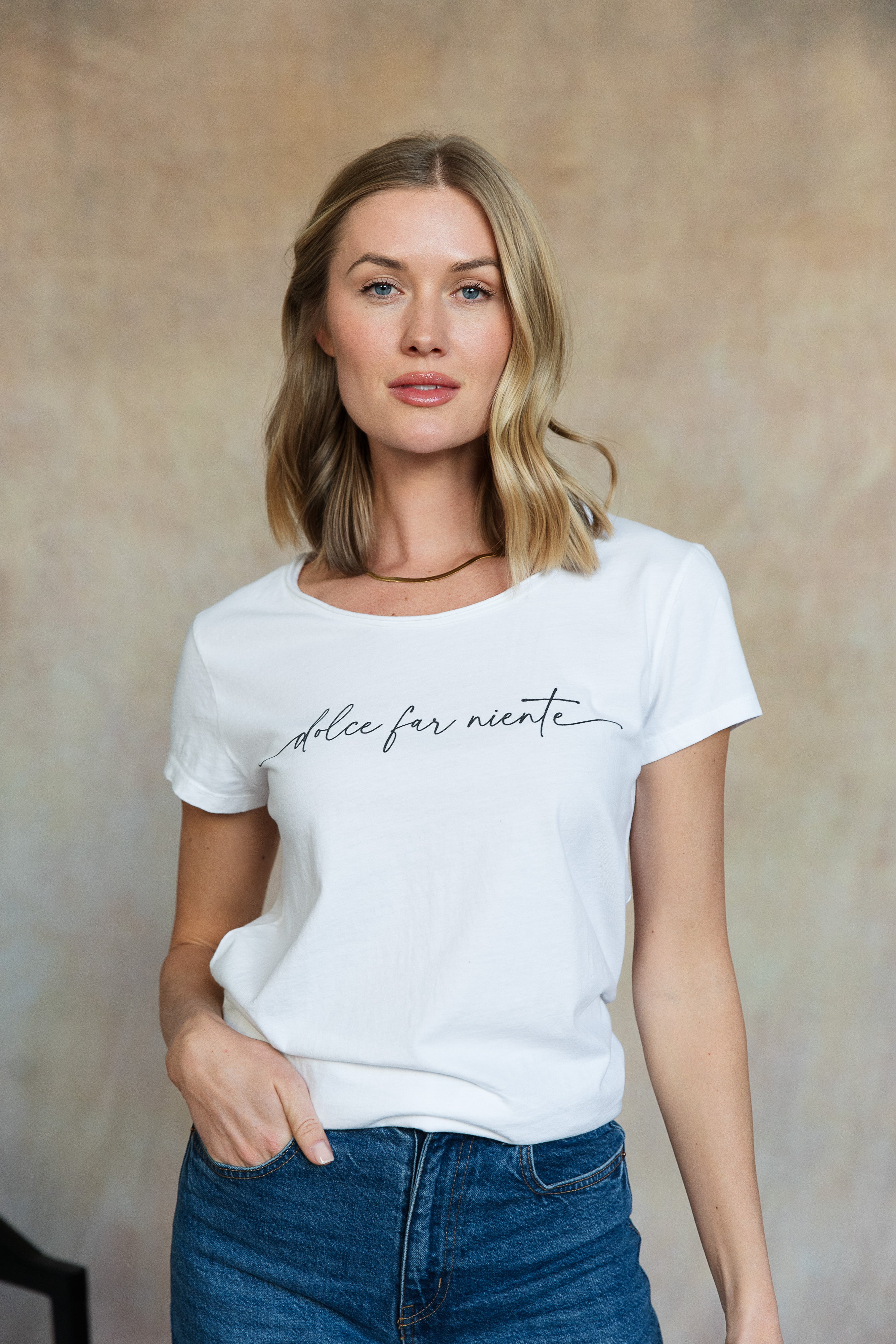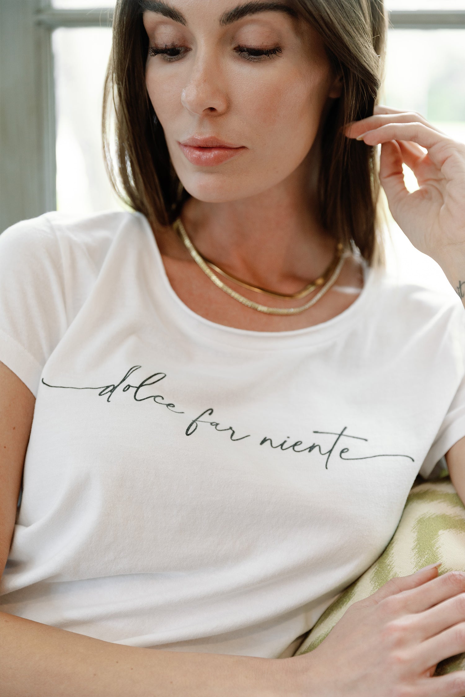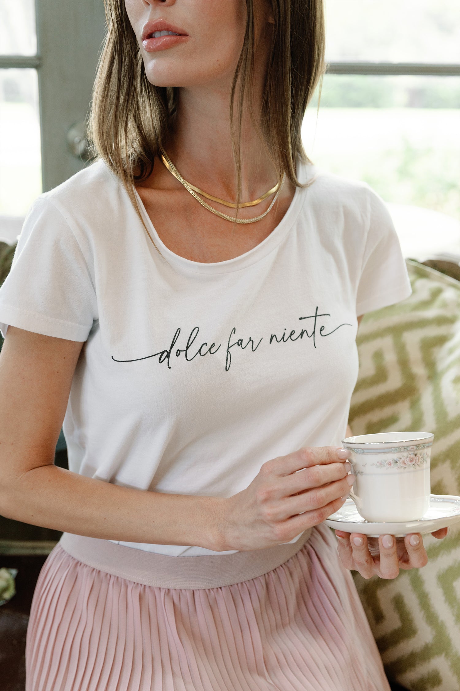 Embrace the "sweetness of doing nothing" in our Dolce Far Niente Graphic Tee, cut from supersoft Italian cotton in a feminine shape with details like a raw-edge boat neck, cap sleeves, and shirttail hem. Part of our Speak Italian Graphic Tee collection.