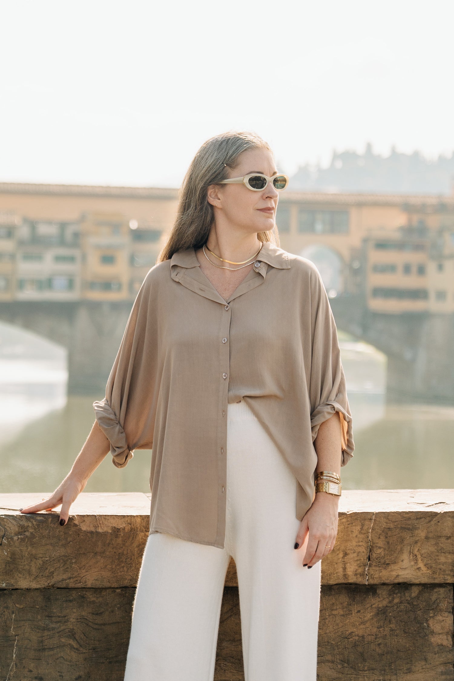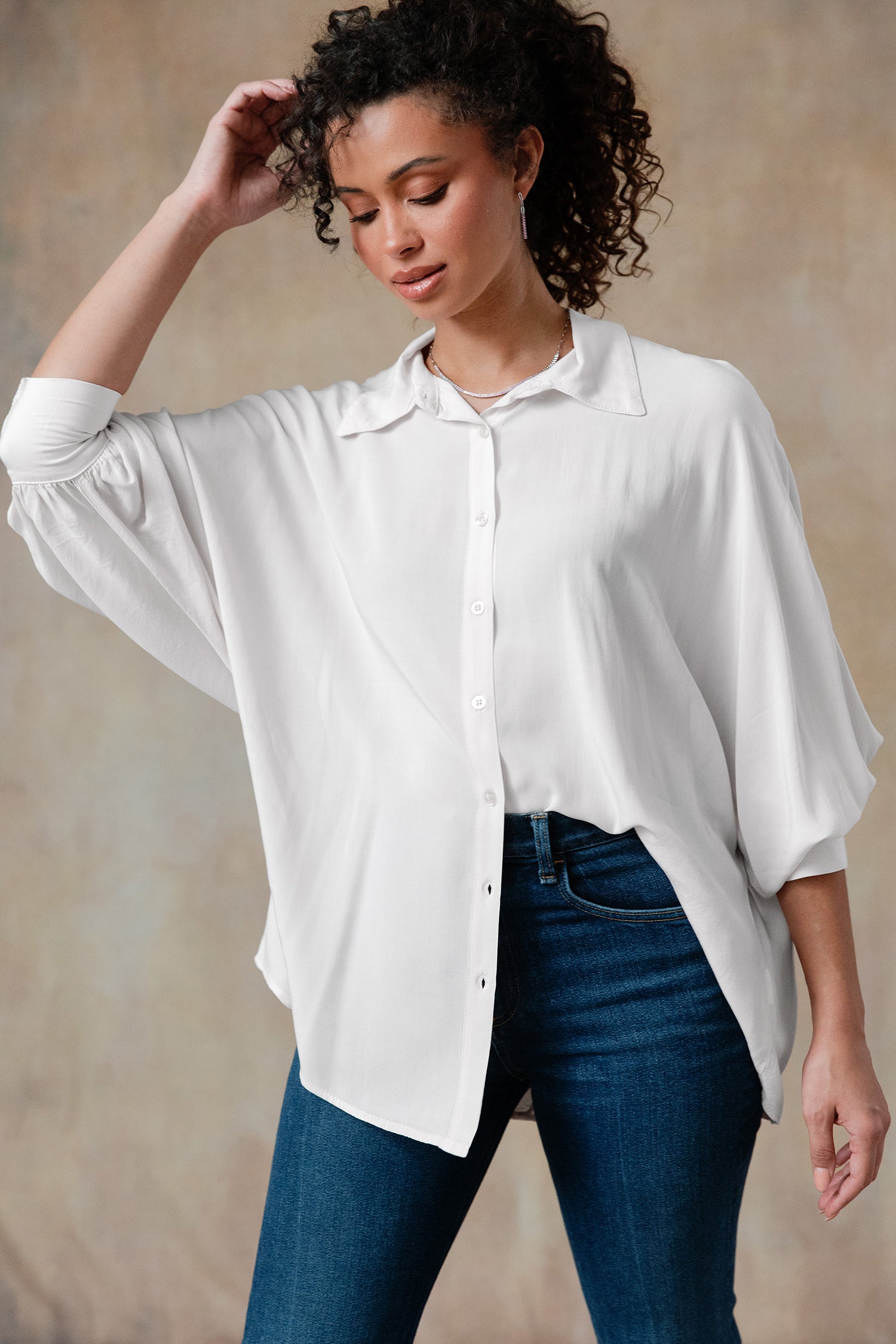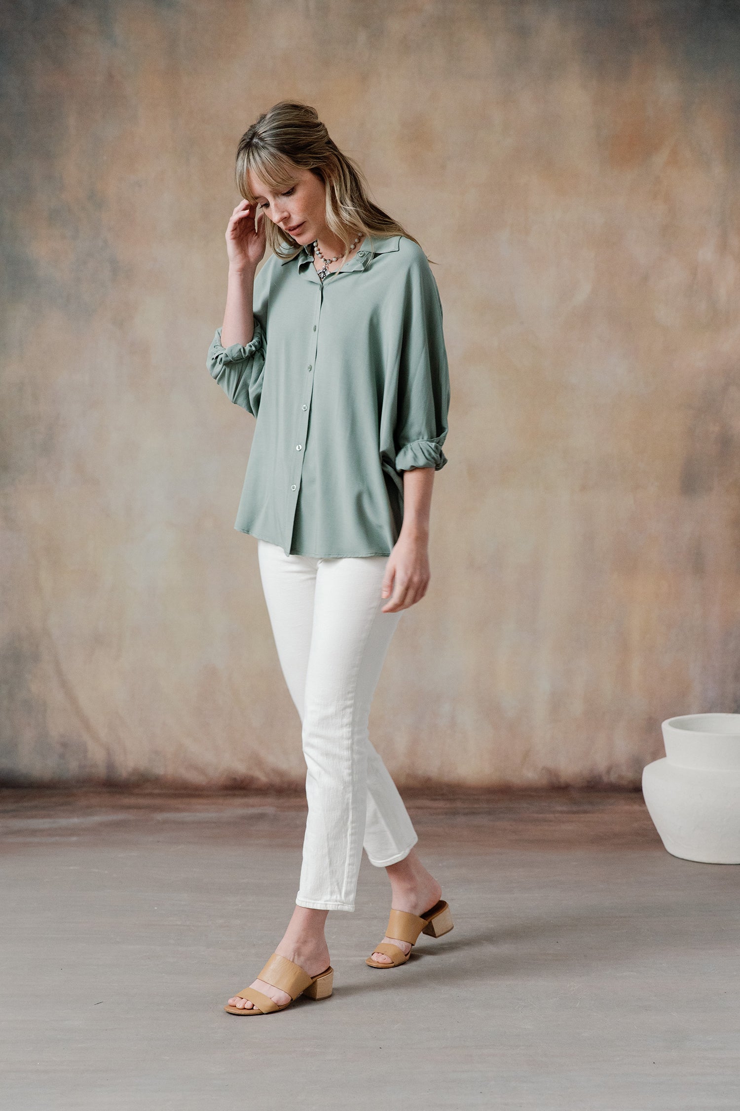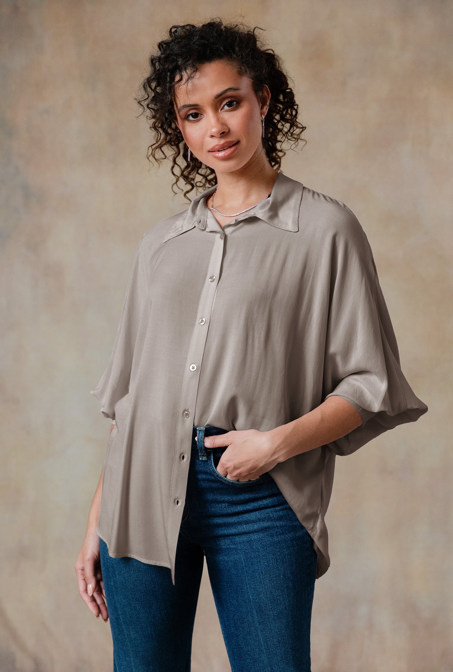 The Remi Shirt is an above-average collared shirt—with a soft drape, graceful dolman sleeves, and a variety of styling options, this will become a go-to in your wardrobe. One of our Signature Styles.