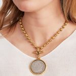 The Riley coin necklace features a vintage coin pendant suspended from a gold chain.