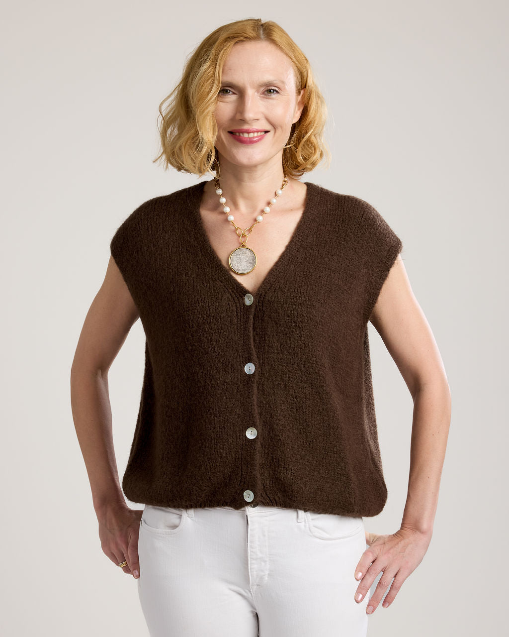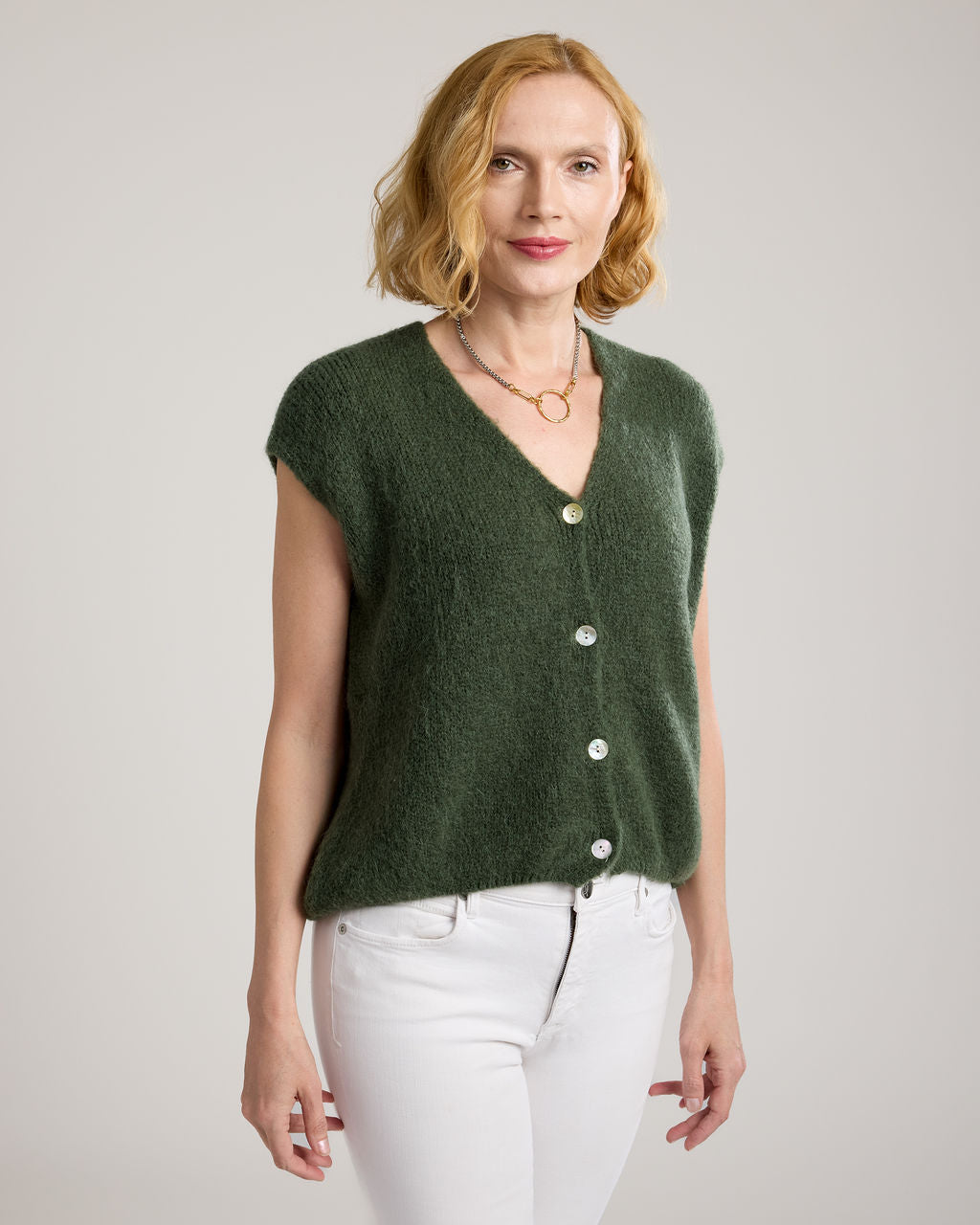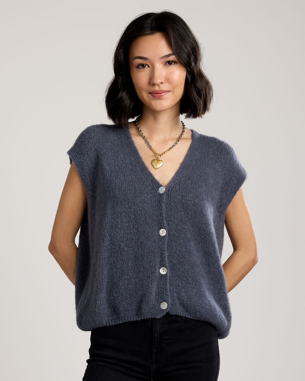 Lightweight and effortlessly versatile, the Alessia Vest is your go-to layering piece for every season. Crafted in Italy from a breathable open knit, it features short sleeves, a relaxed silhouette, and a button-front closure for added styling options