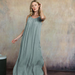 A flowing silhouette inspired by seaside escapes, the Marina Silk Dress captures the grace of warmer weather occasions. This style is made from Italian silk with adjustable spaghetti straps, a gathered neckline, side slits, and a soft viscose lining. Style it with the Mona Silk Topper for a luxuriously layered look or the Lana Linen Topper for a touch of relaxed charm.