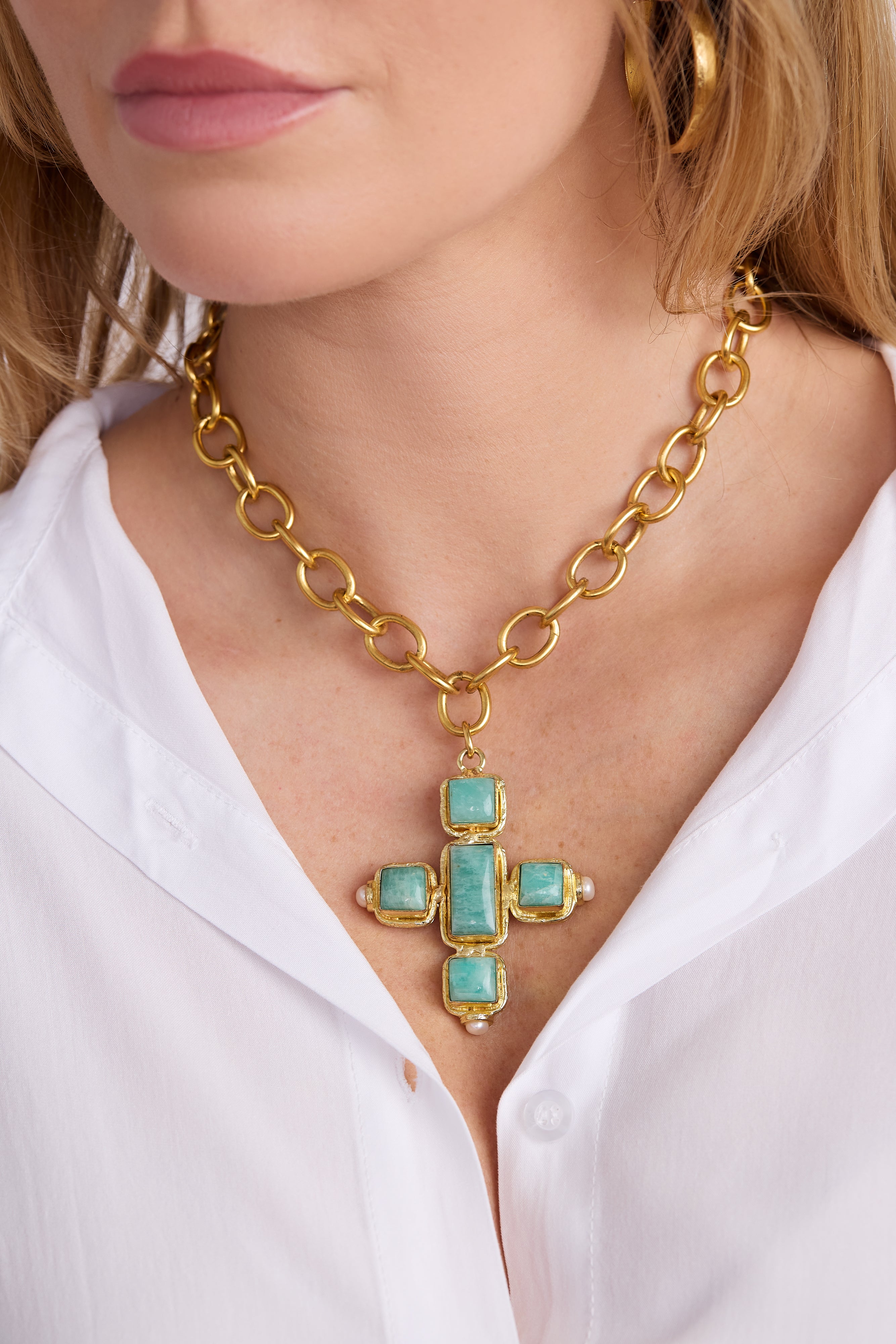 Elegant and meaningful, this cross necklace is available in two stunning options: luminous moonstone or Amazonite. Each cross pendant hangs from a polished gold chain offering a soft, radiant touch that complements any style.