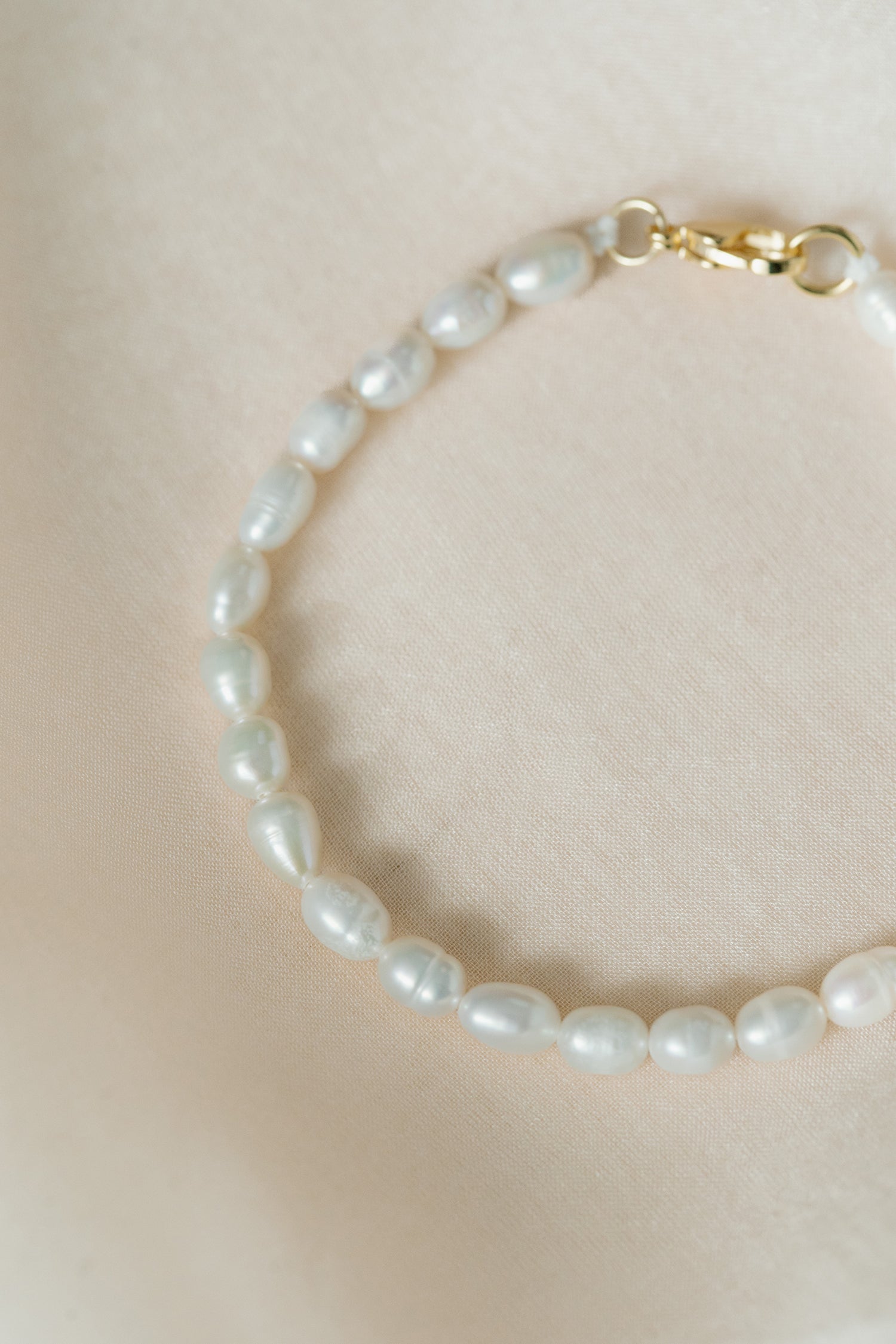 - Chain bracelet, freshwater pearls, lobster-claw closure.