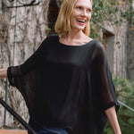 - Boat neck, three-quarter length sleeves with banded cuffs, comfortable knit jersey lining, asymmetrical silk overlay.