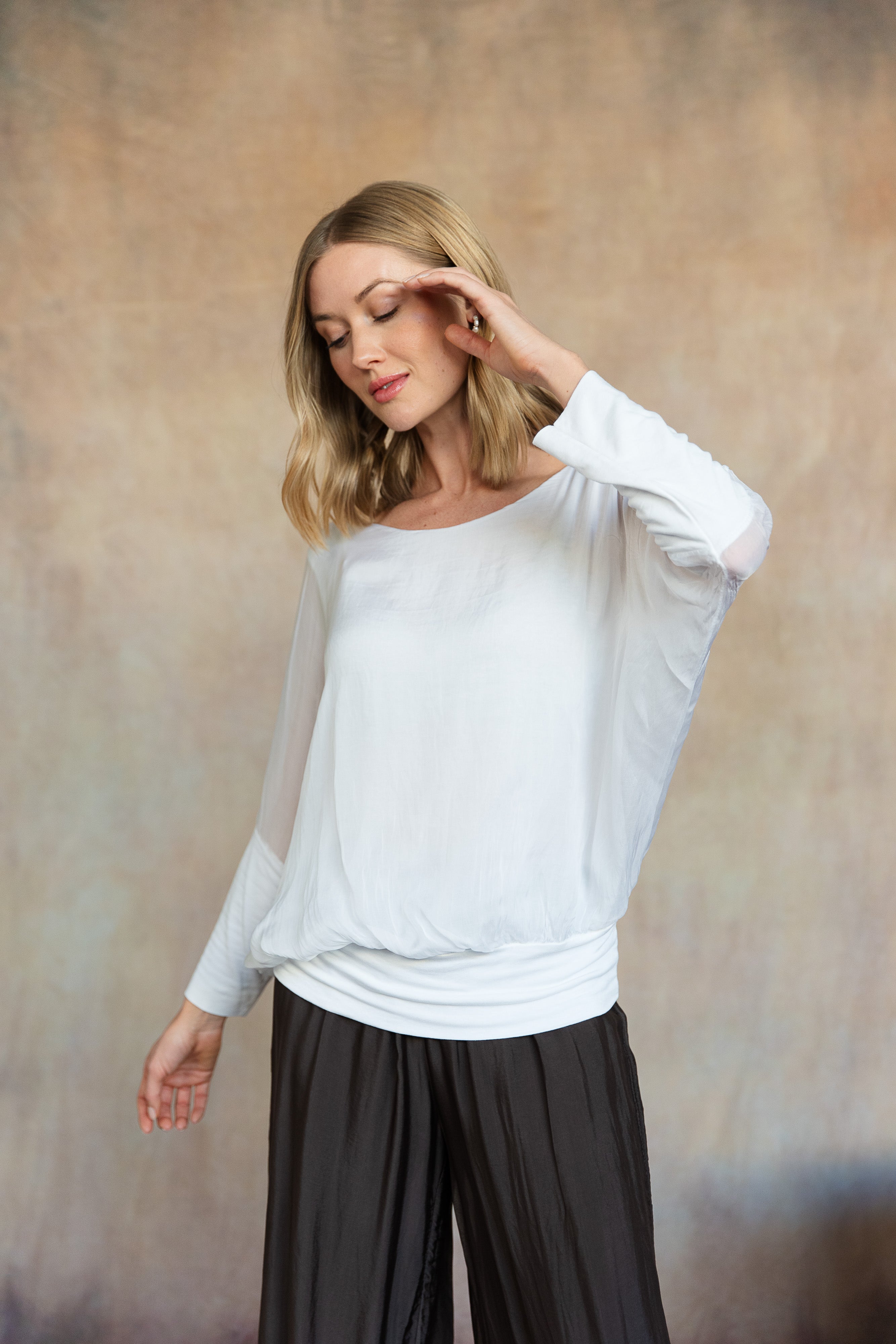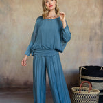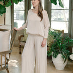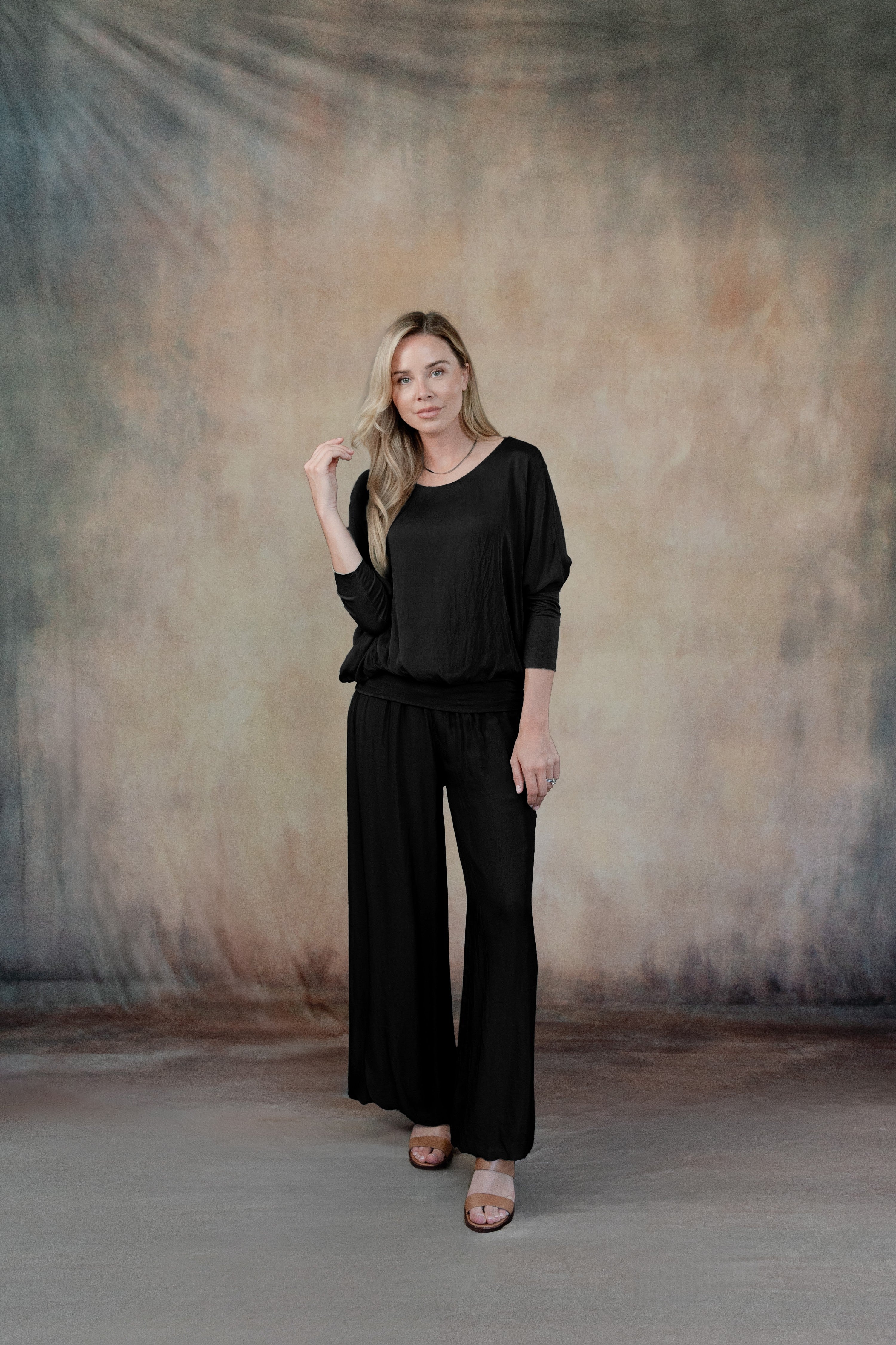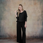 The Cassandra top drapes beautifully, offering a relaxed yet refined silhouette, while the coordinating Madelyn pants provide a tailored yet comfortable fit. Thoughtfully designed in a monochromatic palette, this set is versatile enough to dress up with heels and jewelry or keep casual with flats and a tote.