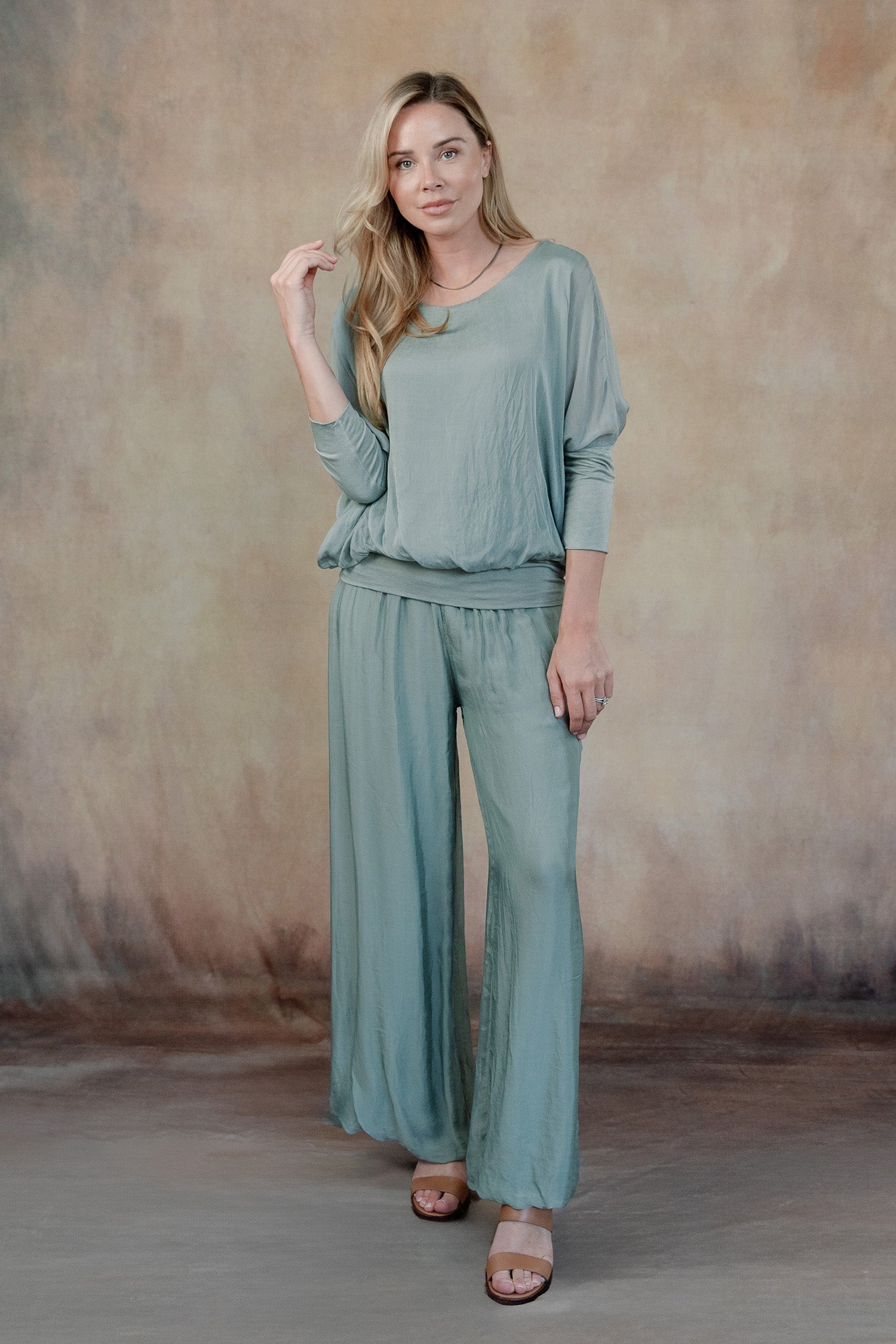 Elevate your wardrobe with the Cassandra silk top and Madelyn silk pant set, a perfectly curated ensemble designed for both comfort and sophistication. Crafted in Italy from luxurious, breathable fabrics, this set embodies effortless elegance with a modern twist.