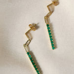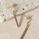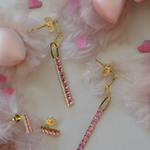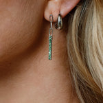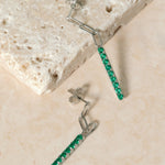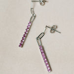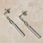 - Half tennis earrings with 2mm claw-set pavé stones, paperclip chains, post with back.