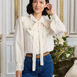 Redefined, the Gianna Blouse blends Edwardian charm with a modern, wearable silhouette. Crafted from airy Italian cotton, it features a button-front design and a softly fitted bodice that flatters without feeling too structured. A feminine tie detail at the neckline which can be tied as a bow or loosely tied for effortless drape.