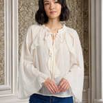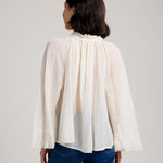 The Gloria Blouse channels timeless Edwardian charm with a modern ease. Crafted from crisp, breathable cotton, it features a softly blousy silhouette with billowing long sleeves that gather gently at the wrist. Feminine details like delicate pleating, a subtle neckline, and graceful drape make it an effortless piece to dress up or down.