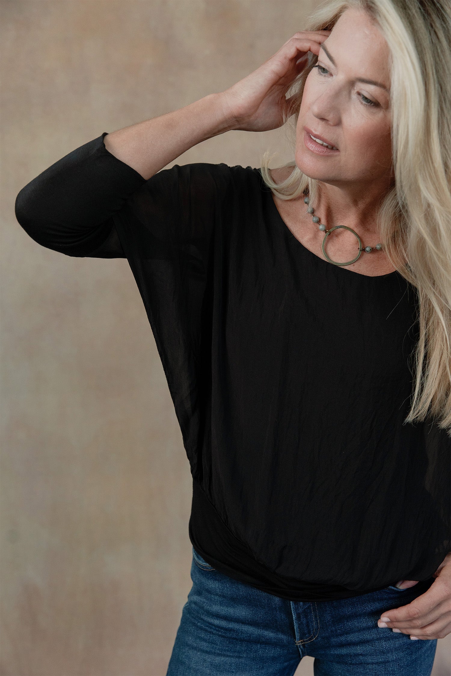 Our iconic Cassandra Silk Top is the pièce de résistance that started it all. This beloved best-seller boasts a luxurious loose silk georgette overlay and a super comfortable viscose shell. The banded hemline adds a touch of sophistication, while the universally flattering fit makes it a wardrobe essential with everyday charm. Whether you’re pairing it with your favorite jeans or our Madelyn Silk Pants for a head-to-toe elevated ensemble, Cassandra effortlessly captures the essence of our brand’s timeless elegance and versatility. Part of our mix-and-match Italian Silk assortment.