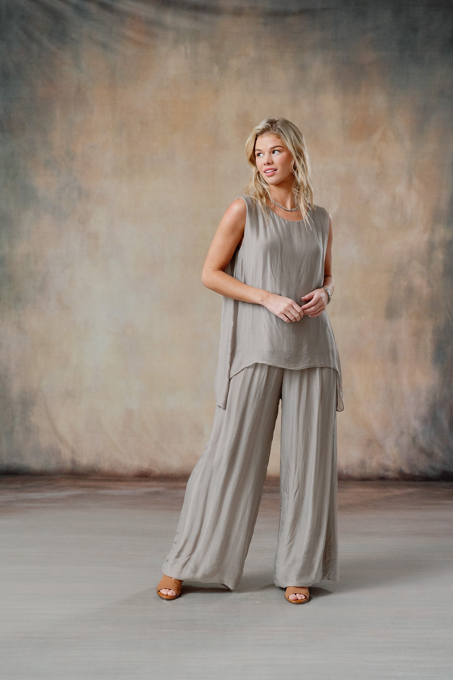 Deni The Madelyn Silk Pants can be defined as classy and graceful with comfort. I have ordered two pairs of these pants and love to wear them with the coordinating Cobblestone Cassandra Silk Top; the look is slenderizing and very flattering. I love this line!