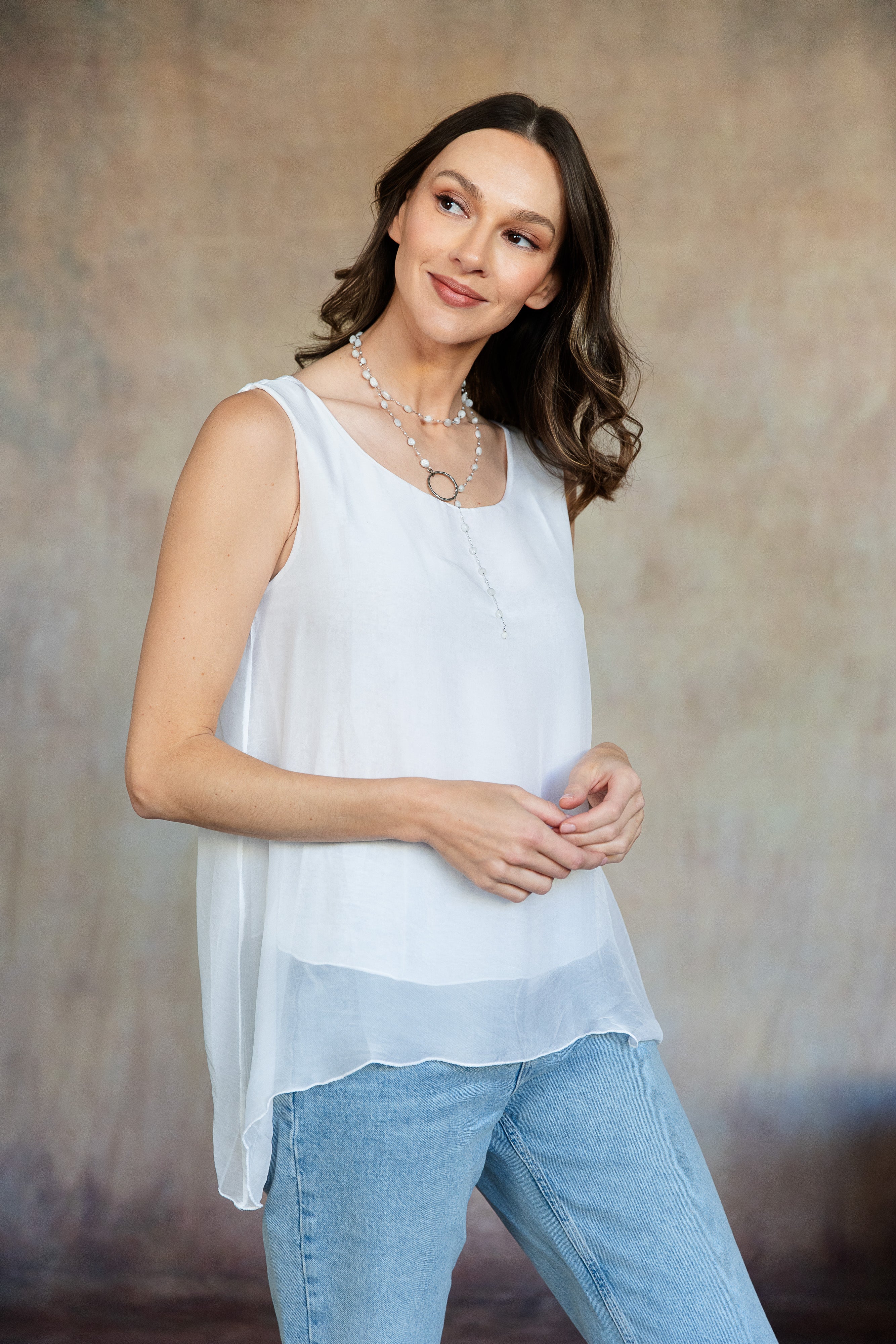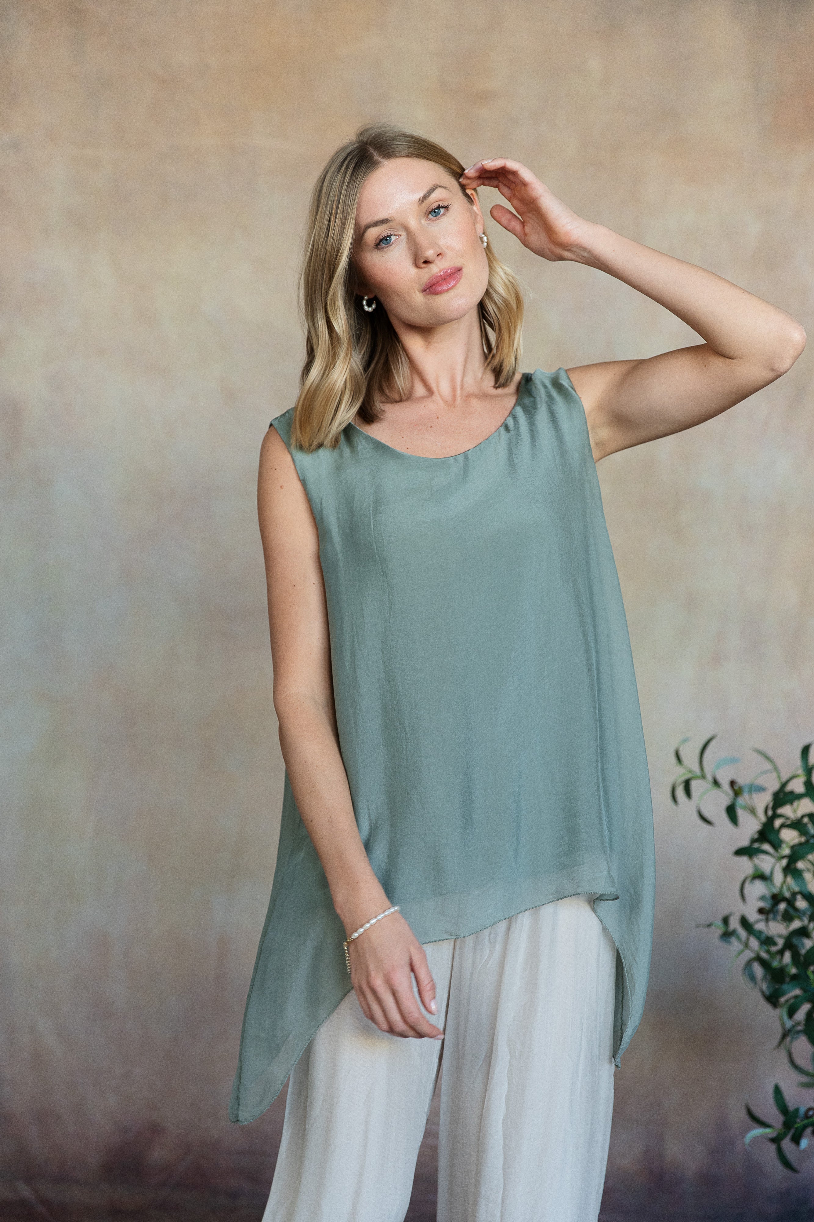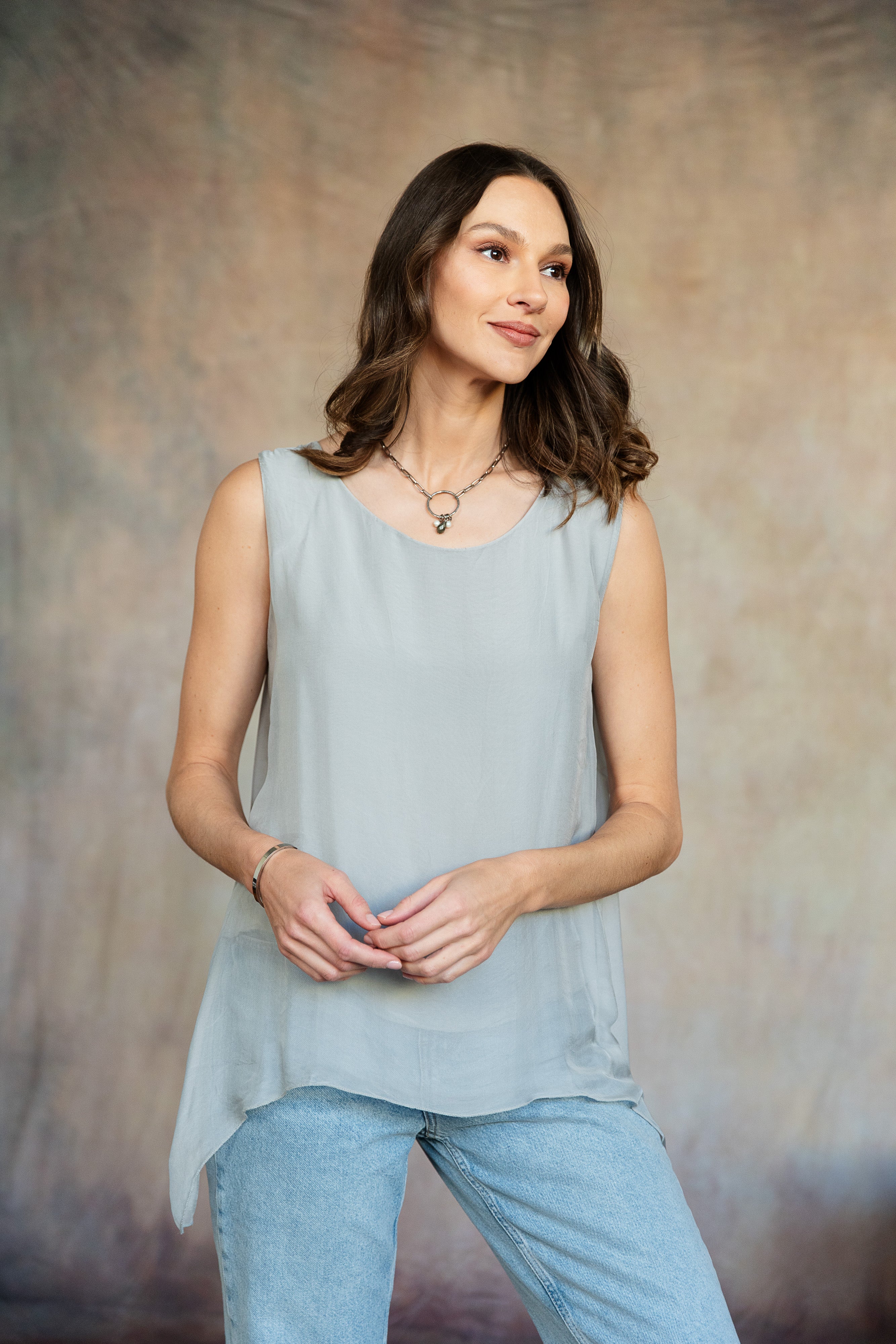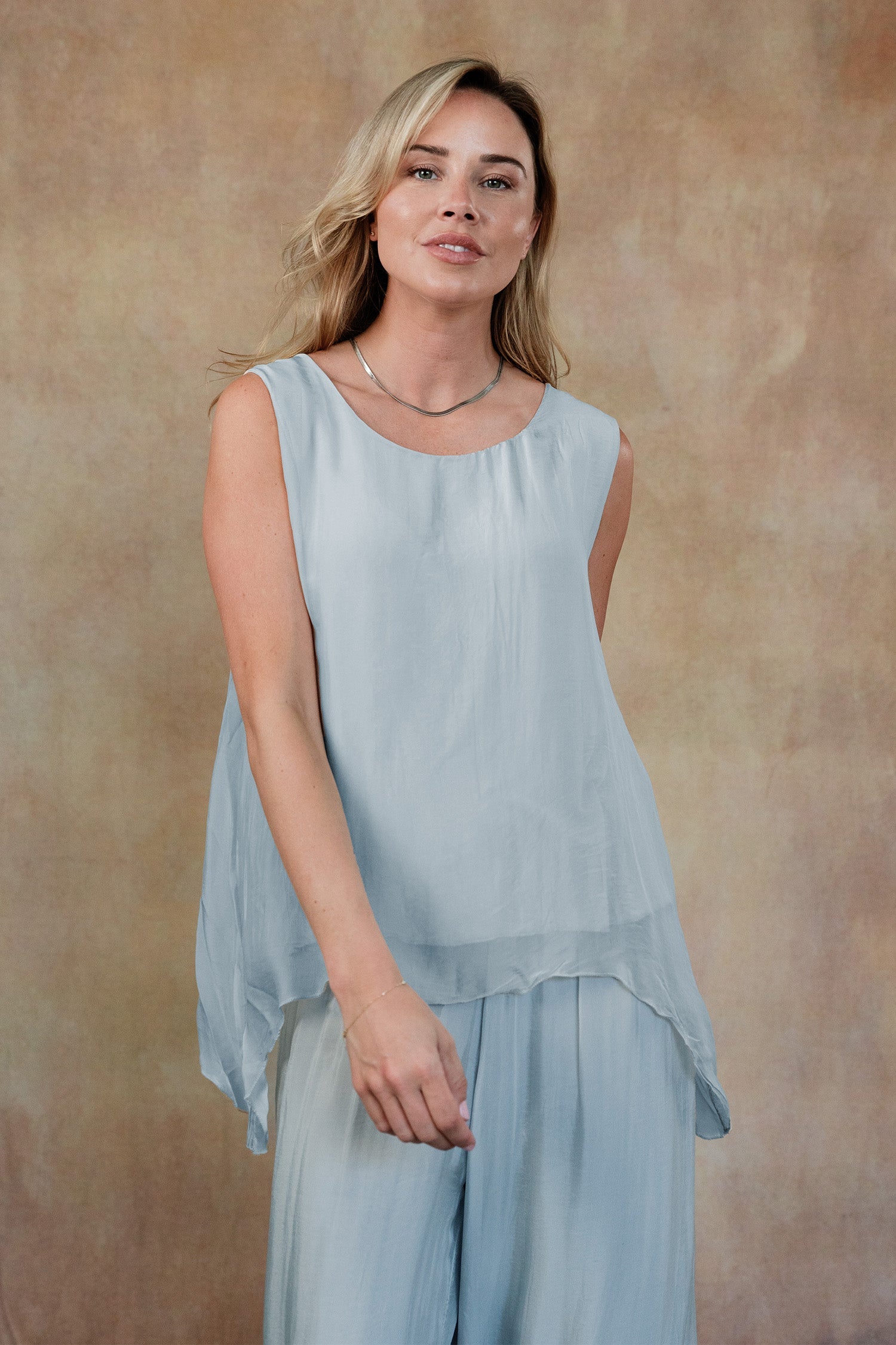 The sleeveless Marianna Silk Top is a masterpiece of elegance and style. This top features luxurious silk layers that drape beautifully, highlighted by a chic asymmetrical hemline. Perfect for pairing with your favorite jeans or pants, the Marianna adds a touch of sophistication to any outfit. Pair it with our Madelyn Silk Pants and experience a chic head-to-toe look that exudes effortless glamour. Part of our mix-and-match Italian Silk assortment.
