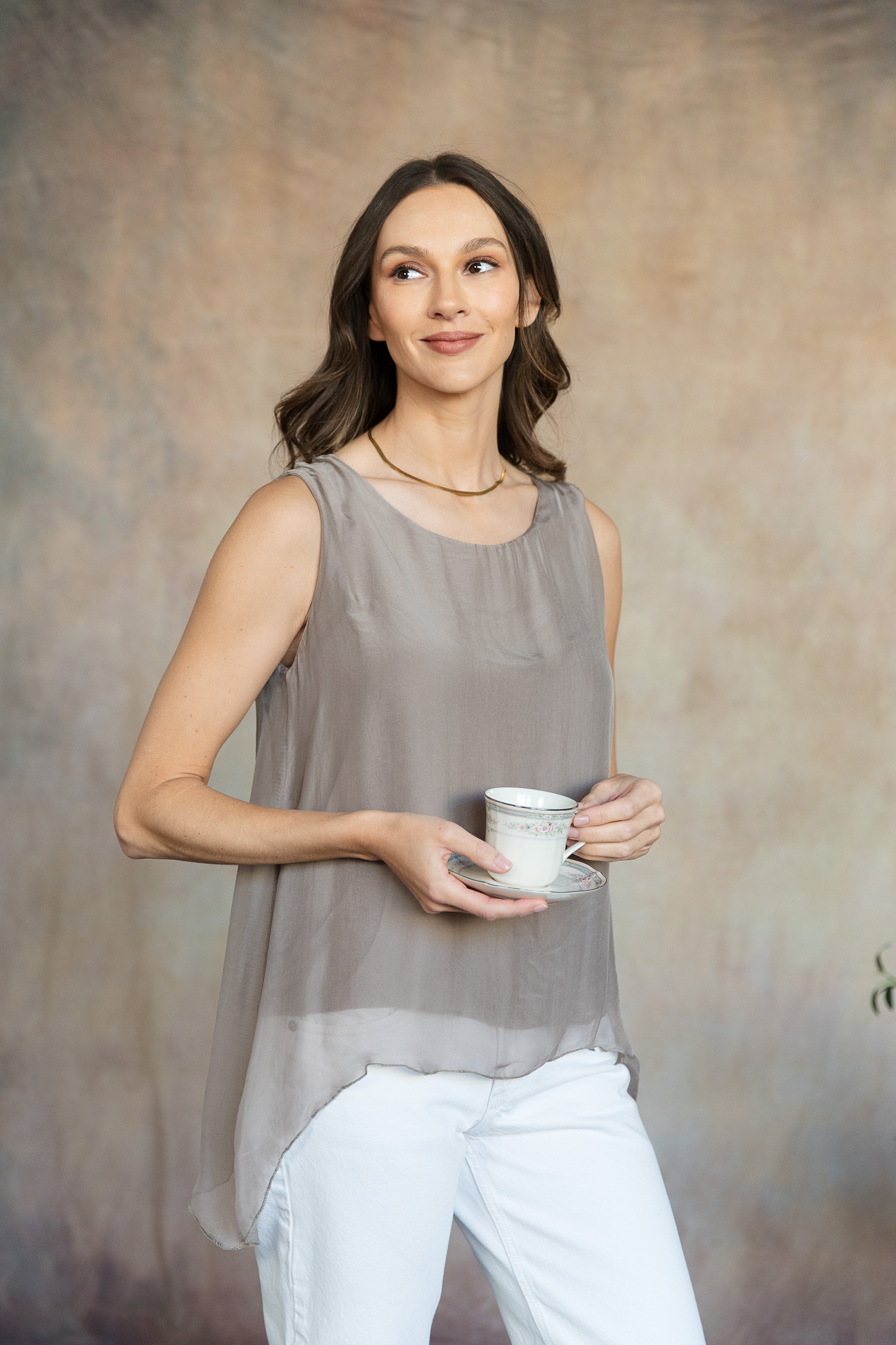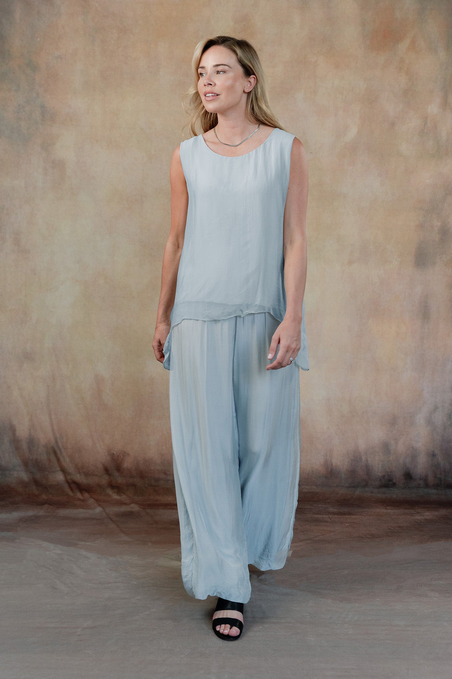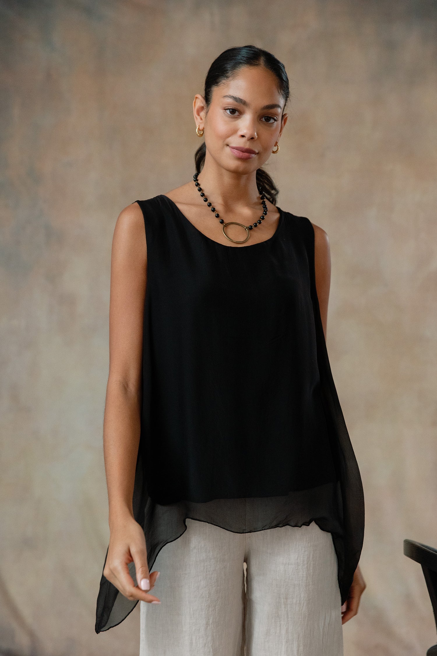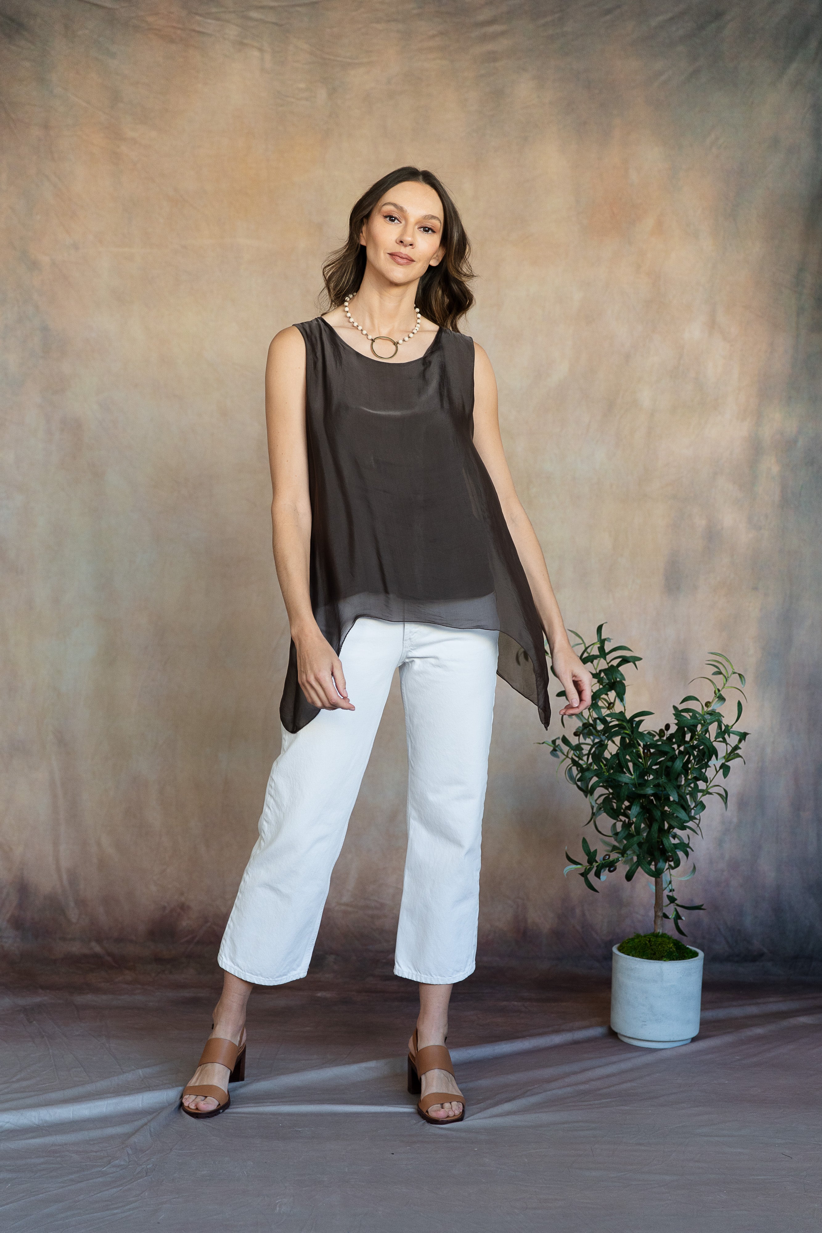 The sleeveless Marianna Silk Top is a masterpiece of elegance and style. This top features luxurious silk layers that drape beautifully, highlighted by a chic asymmetrical hemline. Perfect for pairing with your favorite jeans or pants, the Marianna adds a touch of sophistication to any outfit. Pair it with our Madelyn Silk Pants and experience a chic head-to-toe look that exudes effortless glamour. Part of our mix-and-match Italian Silk assortment.