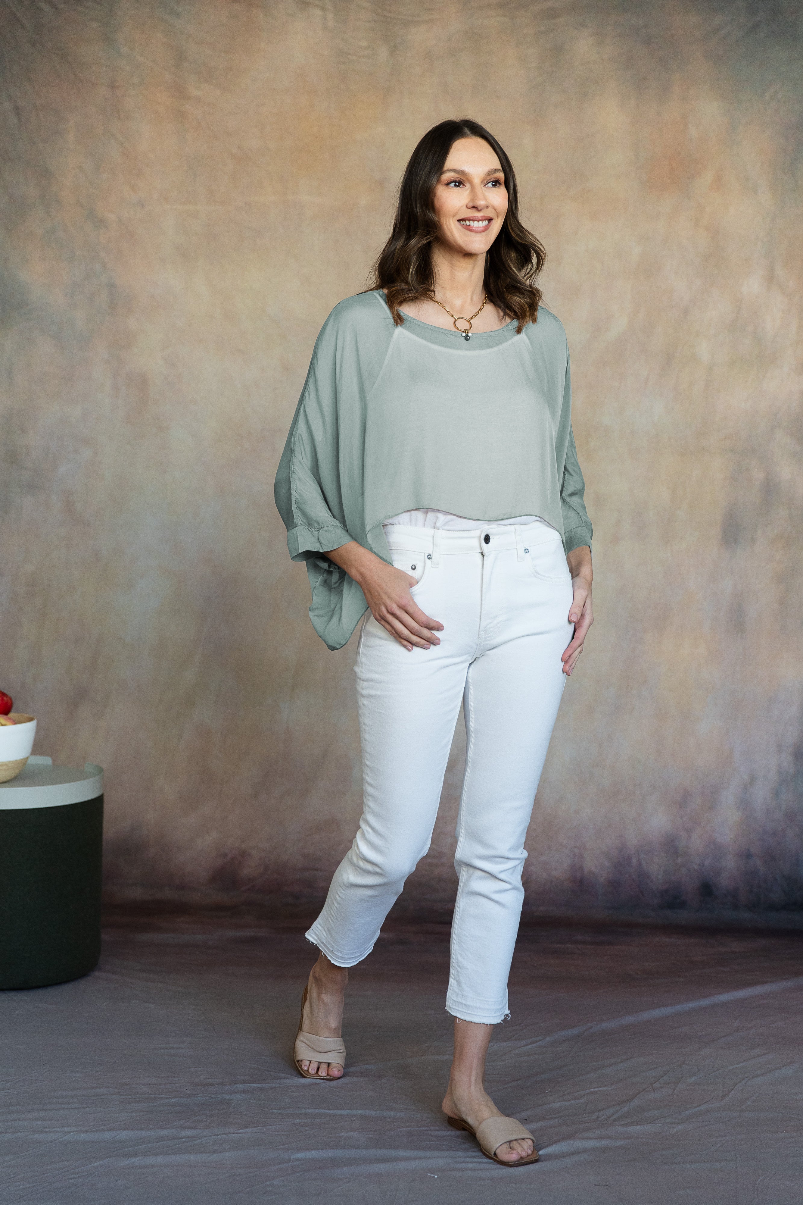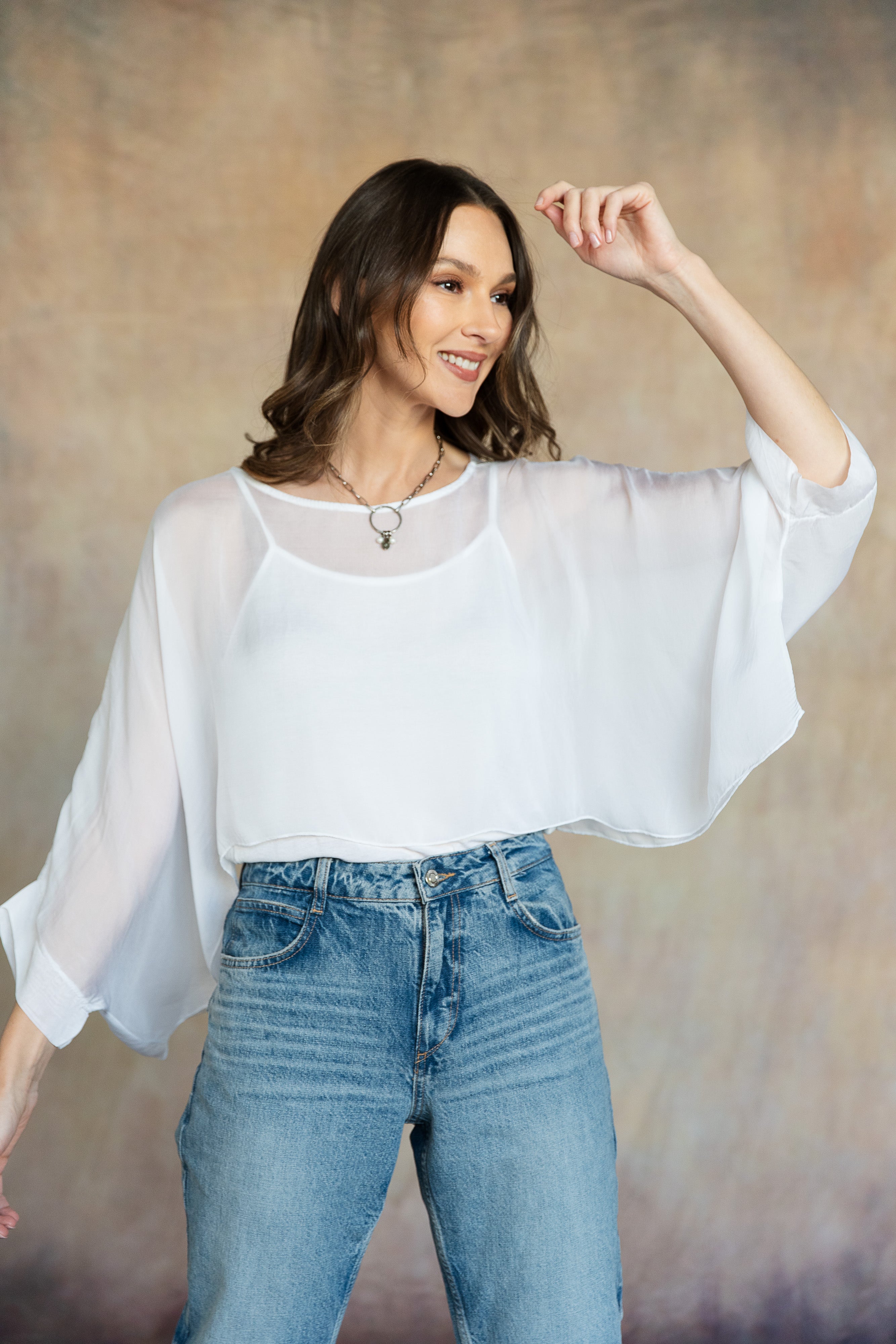 Light and versatile, the Mona Silk Topper adds a feminine touch to any outfit. Its cropped design features flowing dolman sleeves and banded bracelet-length cuffs, making it the perfect accent piece for the season. Complete your look by pairing it with the Marina Silk Dress or Madelyn Silk Pants for an ensemble that moves beautifully with you. Part of our mix-and-match Italian Silk assortment.