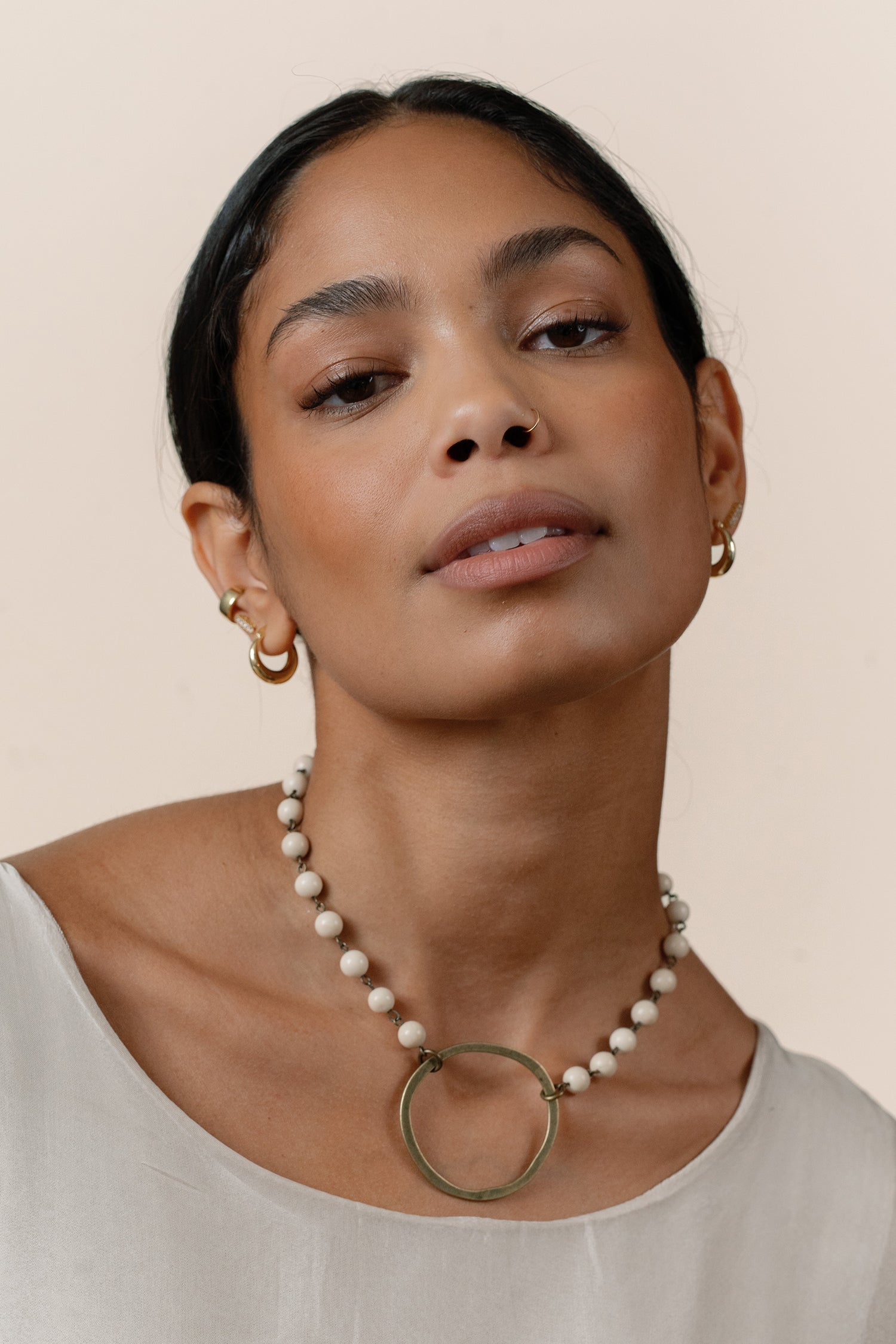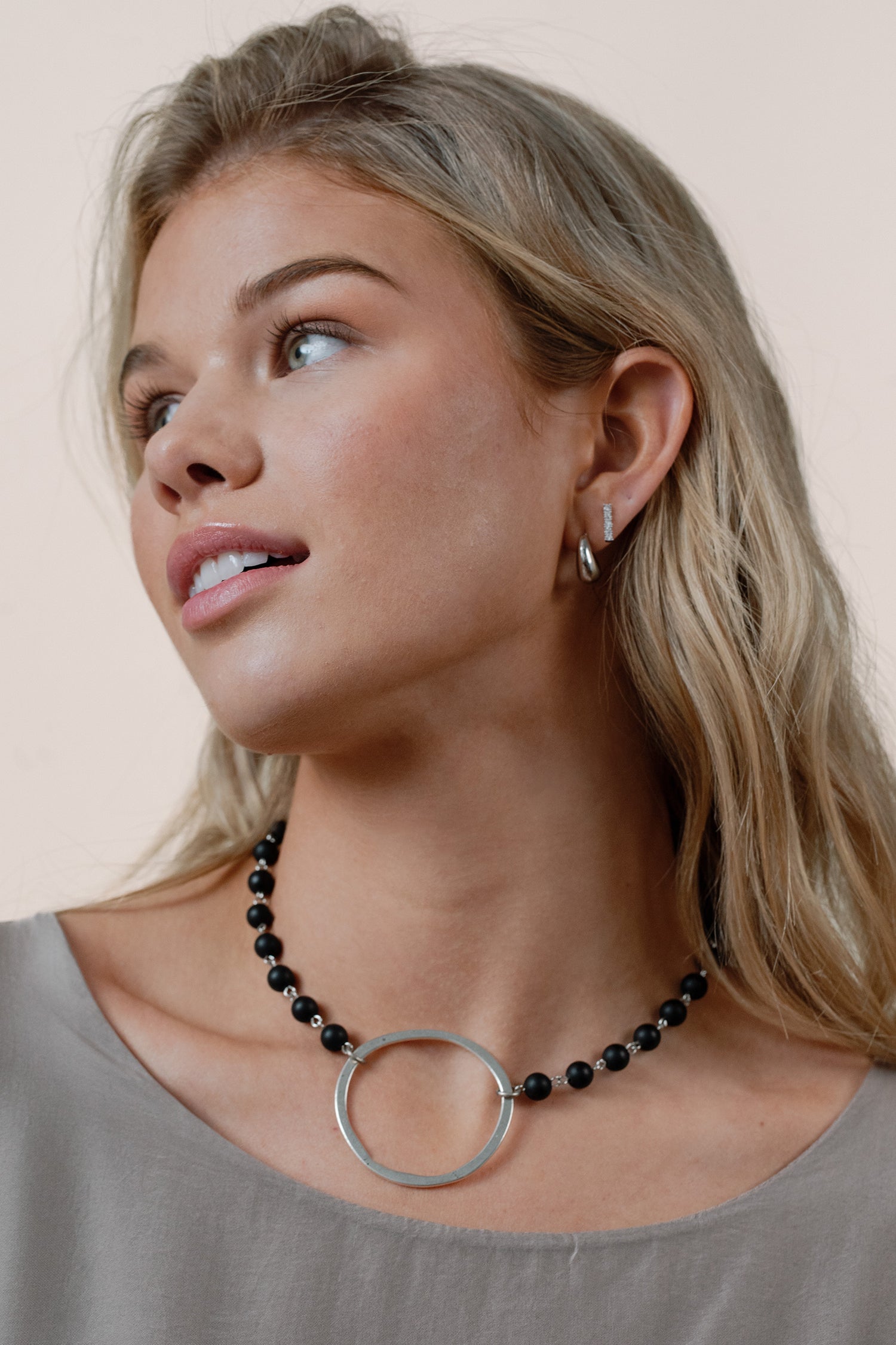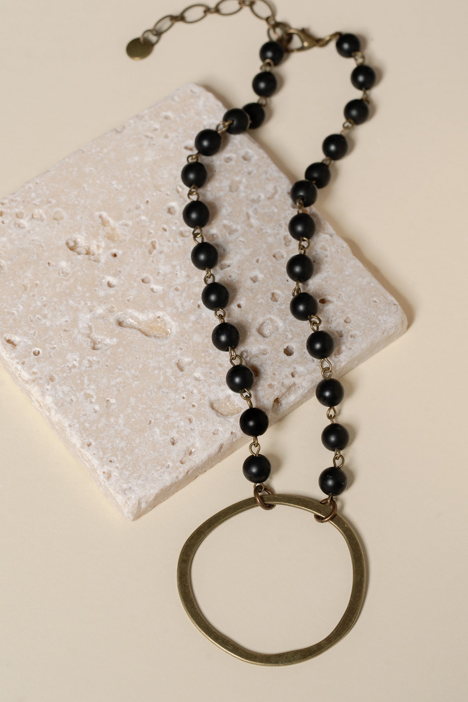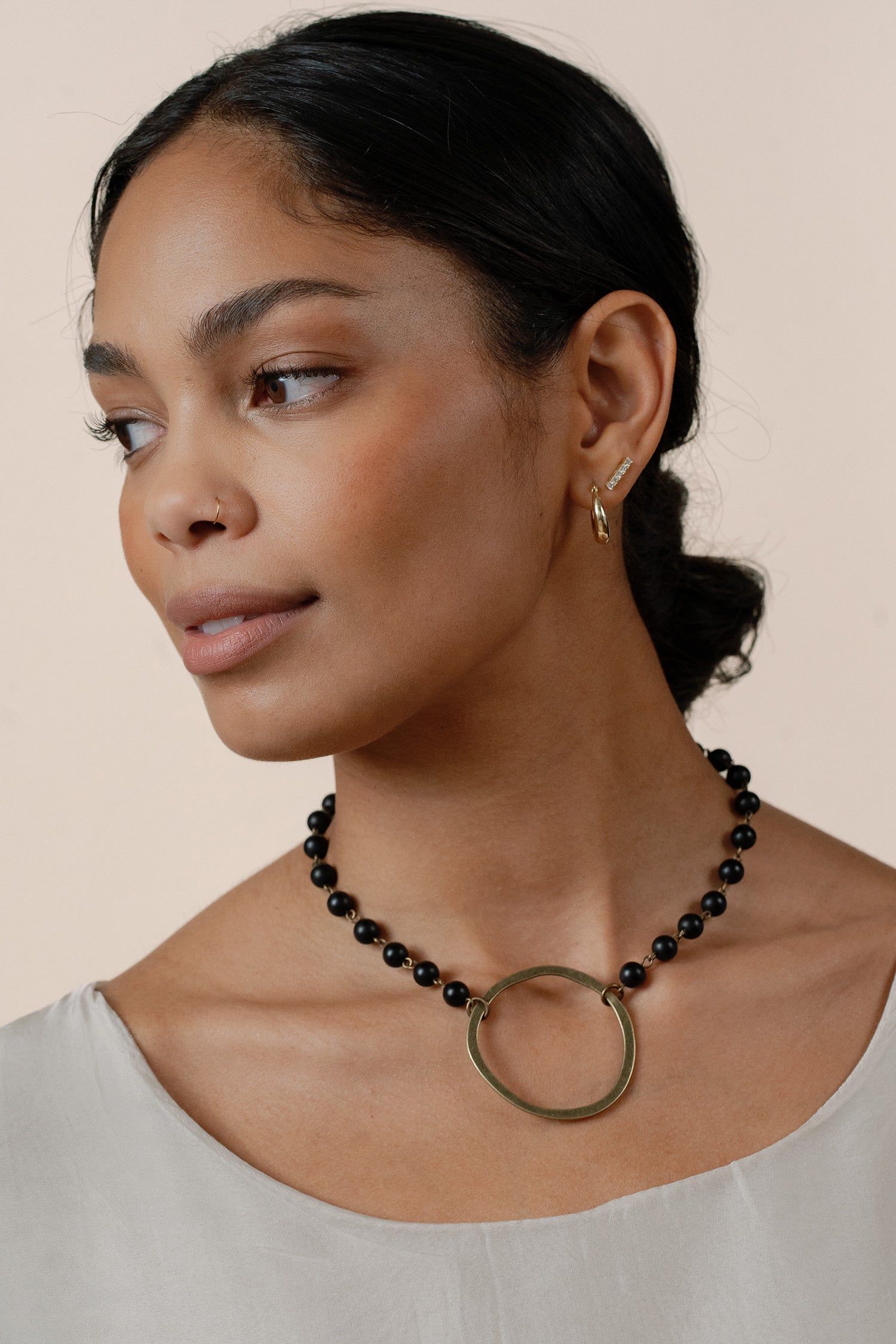 Our Selena necklace puts a metal circle on display with round beads that accent the neckline. Part of our Statement Jewelry assortment.