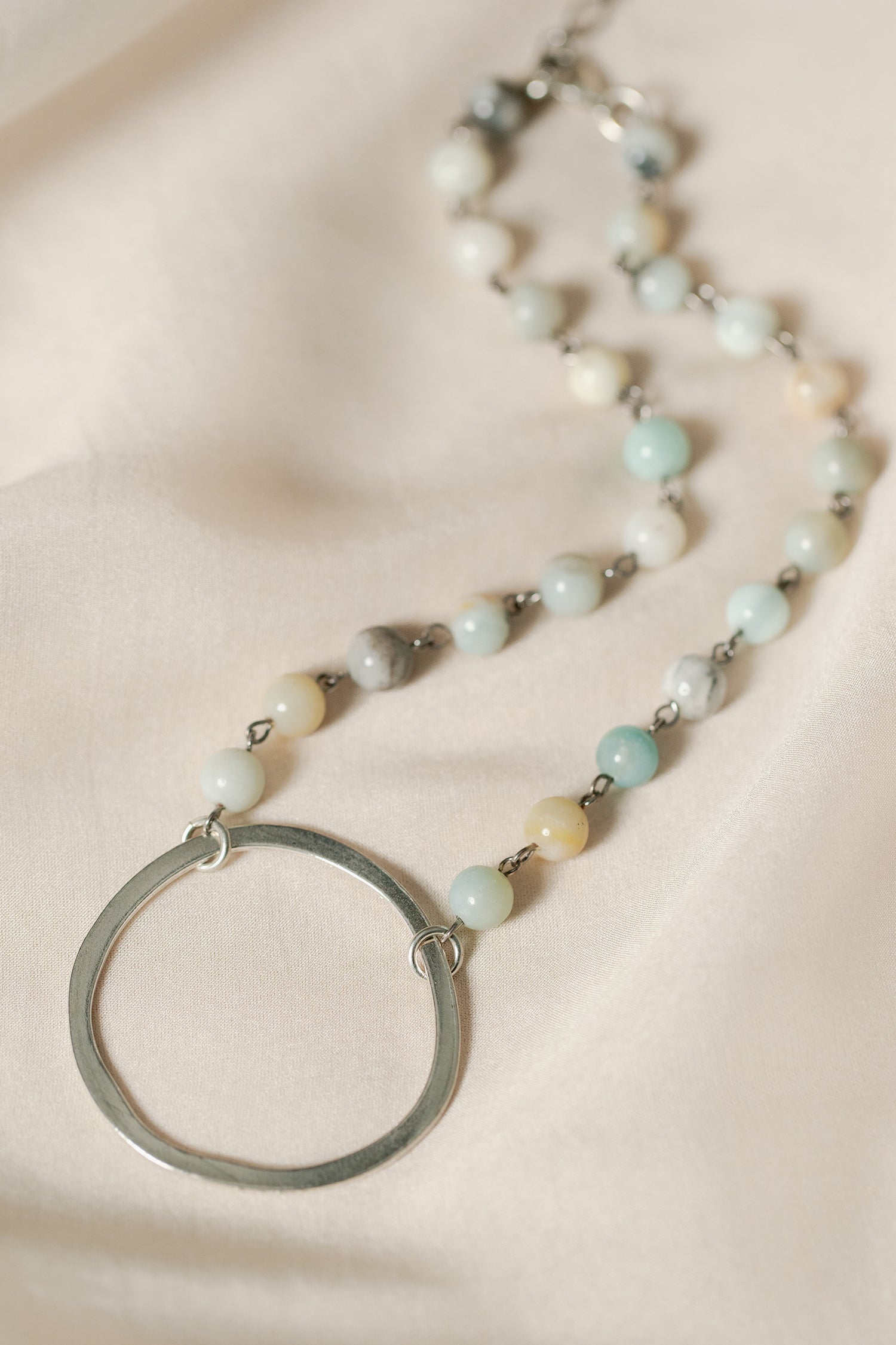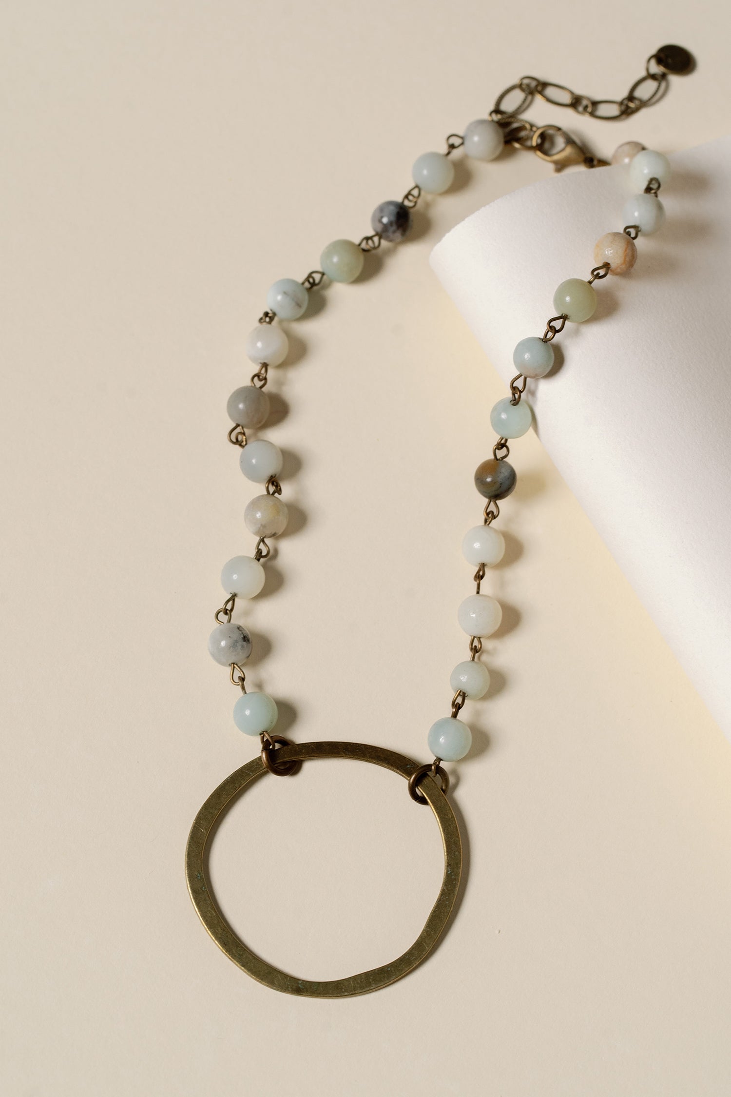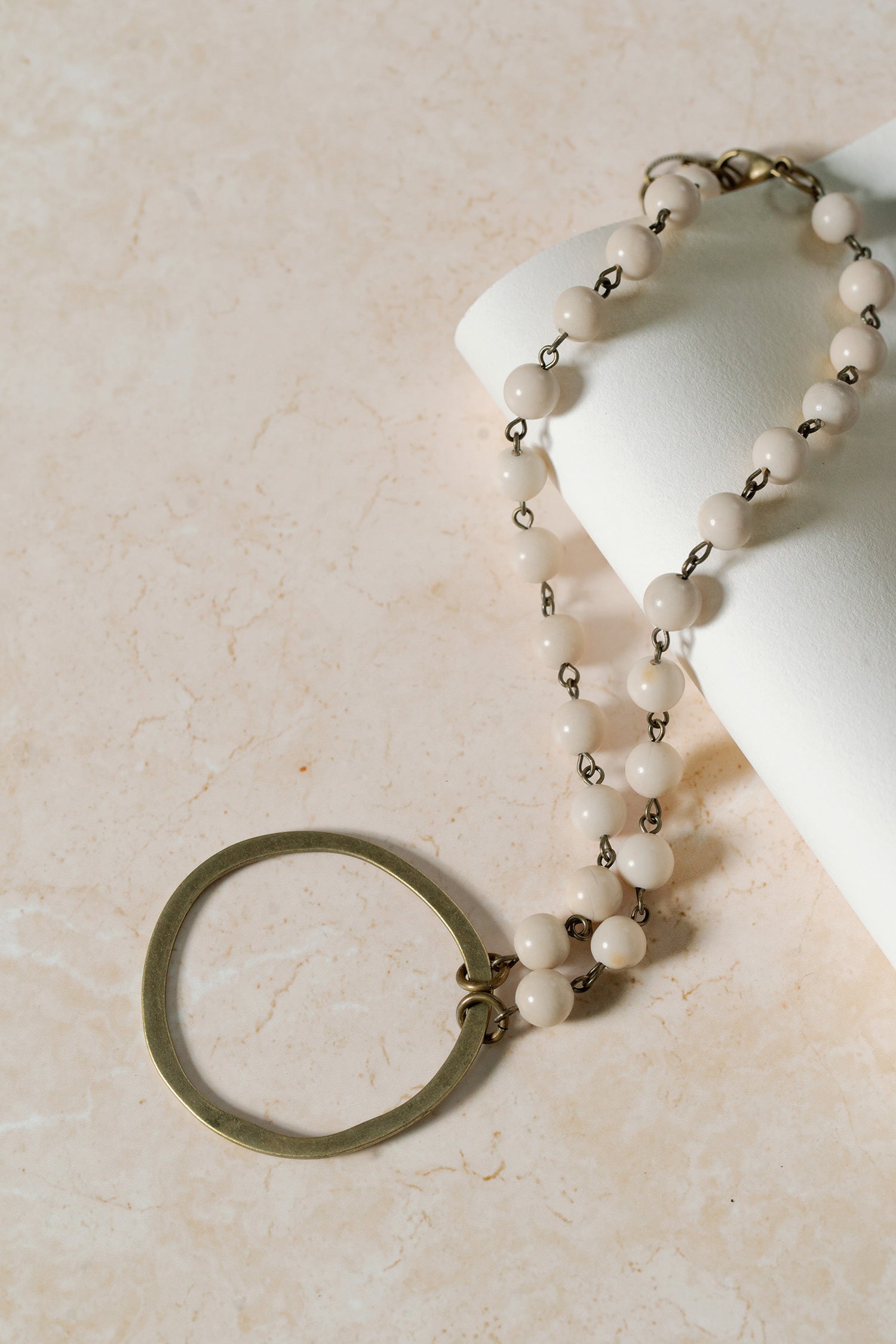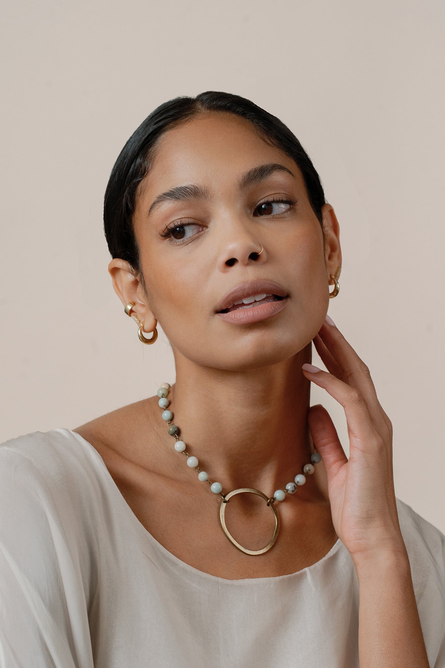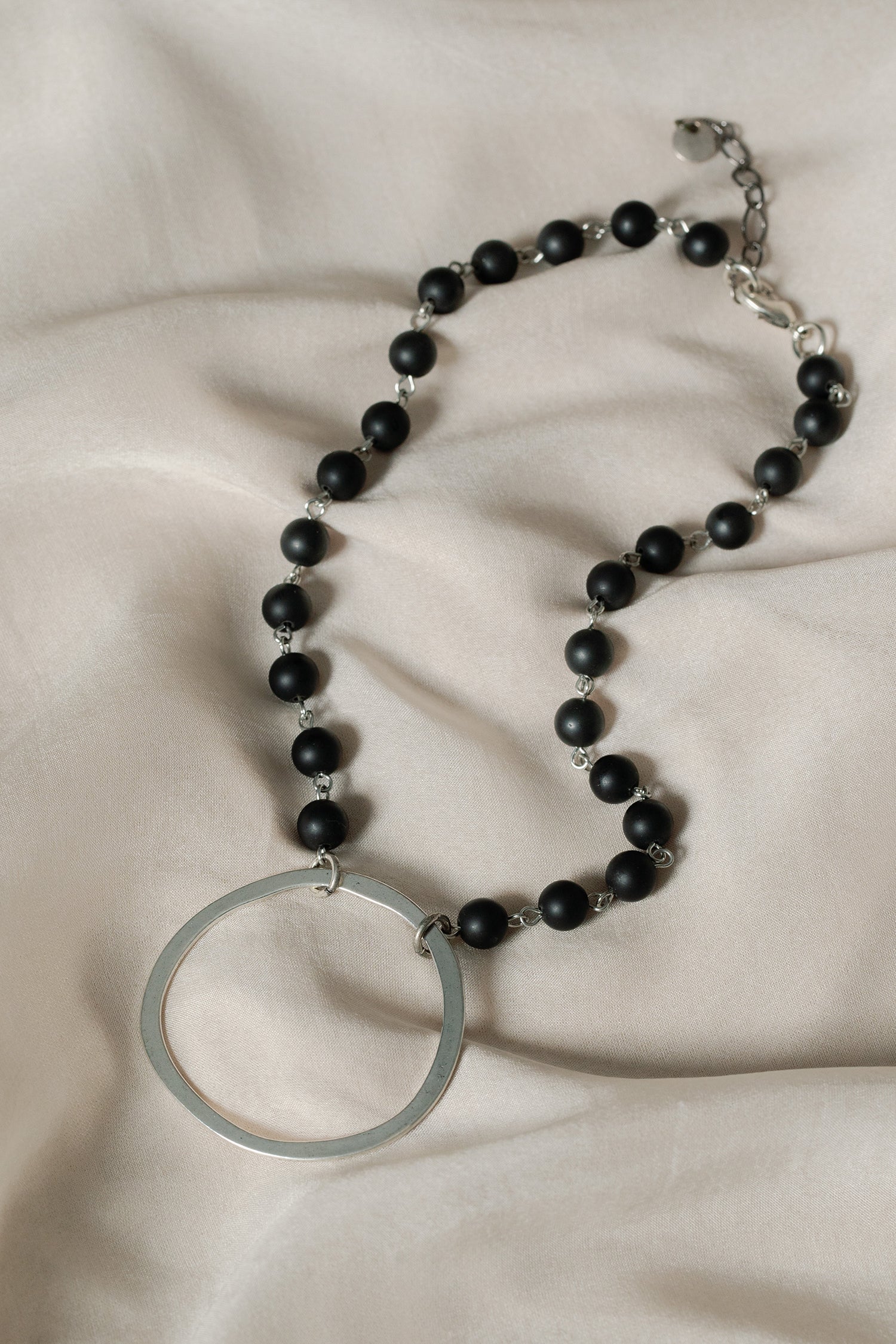 Our Selena necklace puts a metal circle on display with round beads that accent the neckline. Part of our Statement Jewelry assortment.