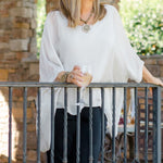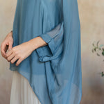 - Boat neck, three-quarter length sleeves with banded cuffs, comfortable knit jersey lining, asymmetrical silk overlay.