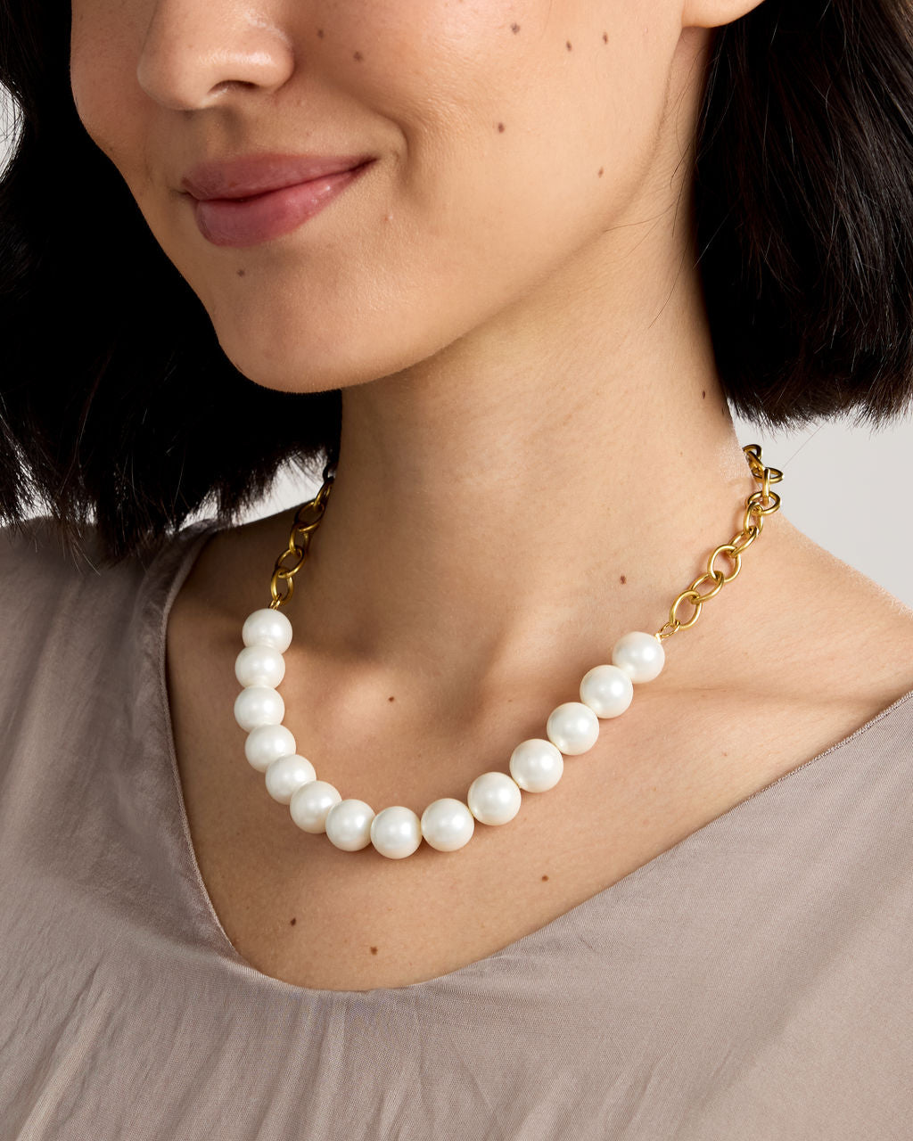 The Susanne necklace brings together two timeless elements—lustrous pearls or onyx and a polished chain—for a look that’s equal parts classic and contemporary. Designed to sit just at the collarbone, this striking half-and-half necklace makes a subtle statement whether worn alone or layered.